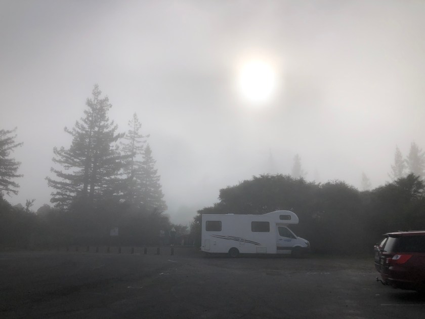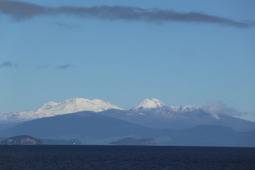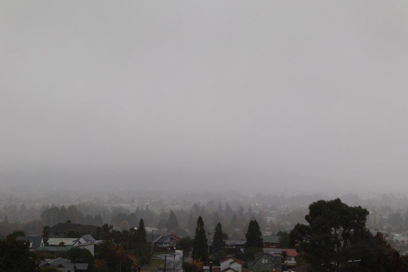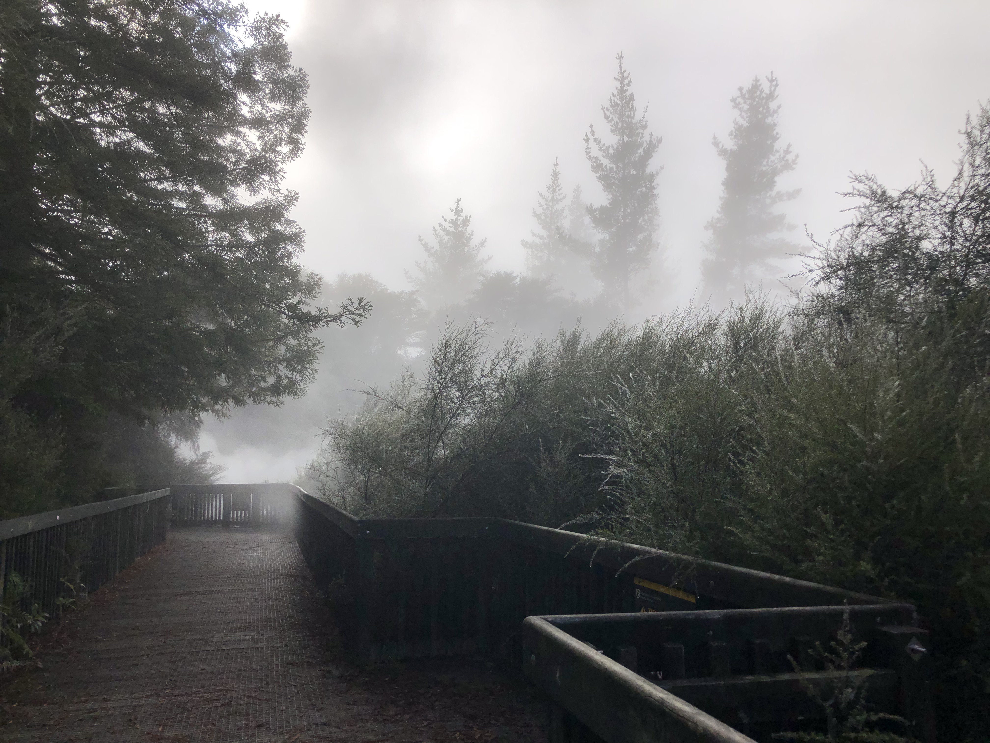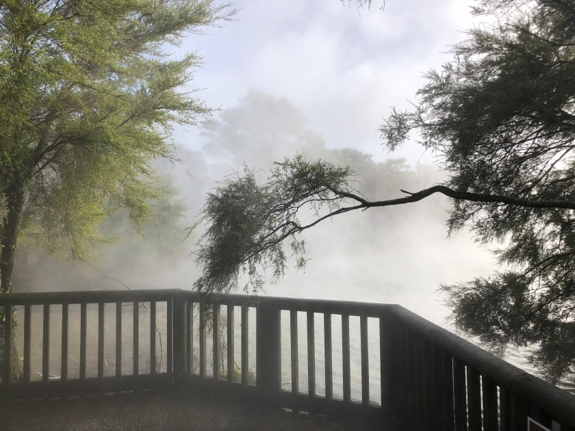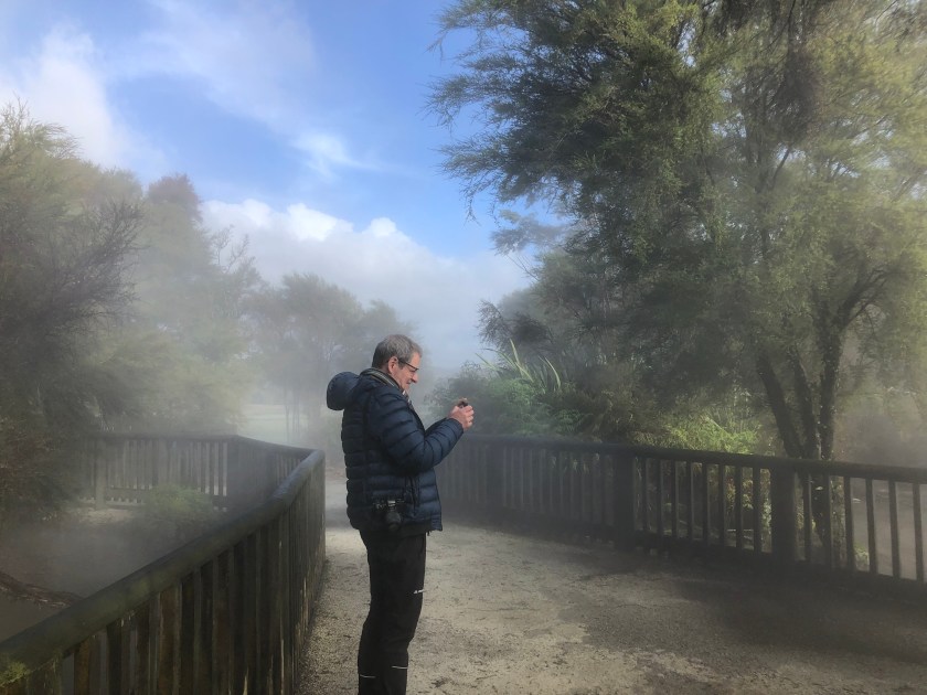 Aber nun zu unserer letzten gemeinsamen Etappe, die uns nach Rotorua führte: Am Samstag Morgen brachen wir im bedeckten Taupo auf Richtung Rotorua, uns war also kein letzter Blick auf die drei Vulkane am anderen Seeufer vergönnt. Und bald sahen wir gar nichts mehr, dichter Nebel hatte sich breit gemacht, so dass die Fahrt für den armen Tibor, der heute der Chauffeur war, ganz schön stressig und langsam wurde.