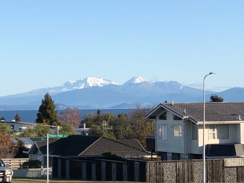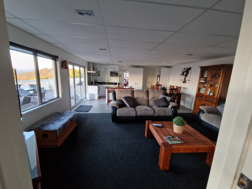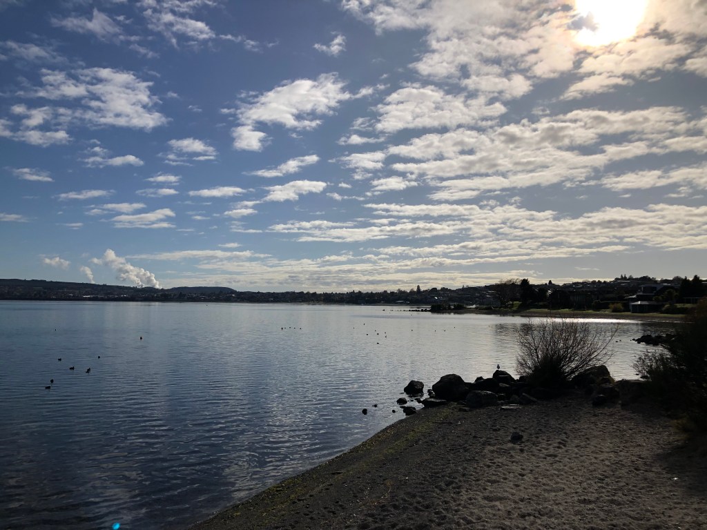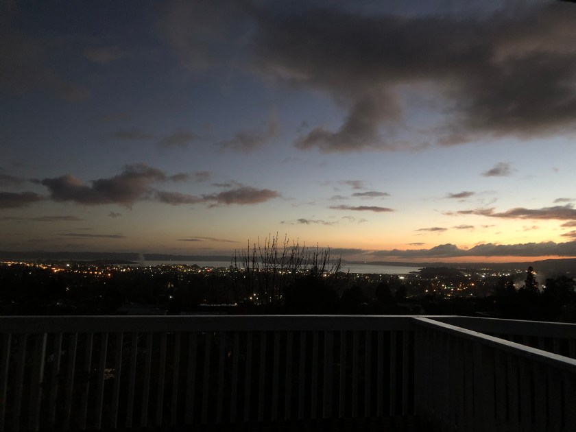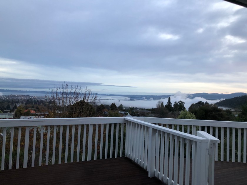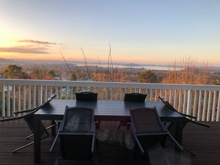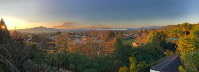 Da wir jede Menge fotografierten und sämtliche Infotafeln studierten und uns auch sonst viel Zeit ließen, war es tatsächlich nach 16.00 Uhr, bis wir Waimangu verließen und uns auf die letzten Kilometer nach Rotorua machten. Zum Glück war es gerade noch hell, so dass wir unsere Unterkunft noch im Tageslicht suchen konnten, sie war gar nicht so einfach zu finden! Endlich angekommen bot sich uns ein atemberaubender Blick von unserem riesigen Deck, das im Sommer echt genial sein muss:
