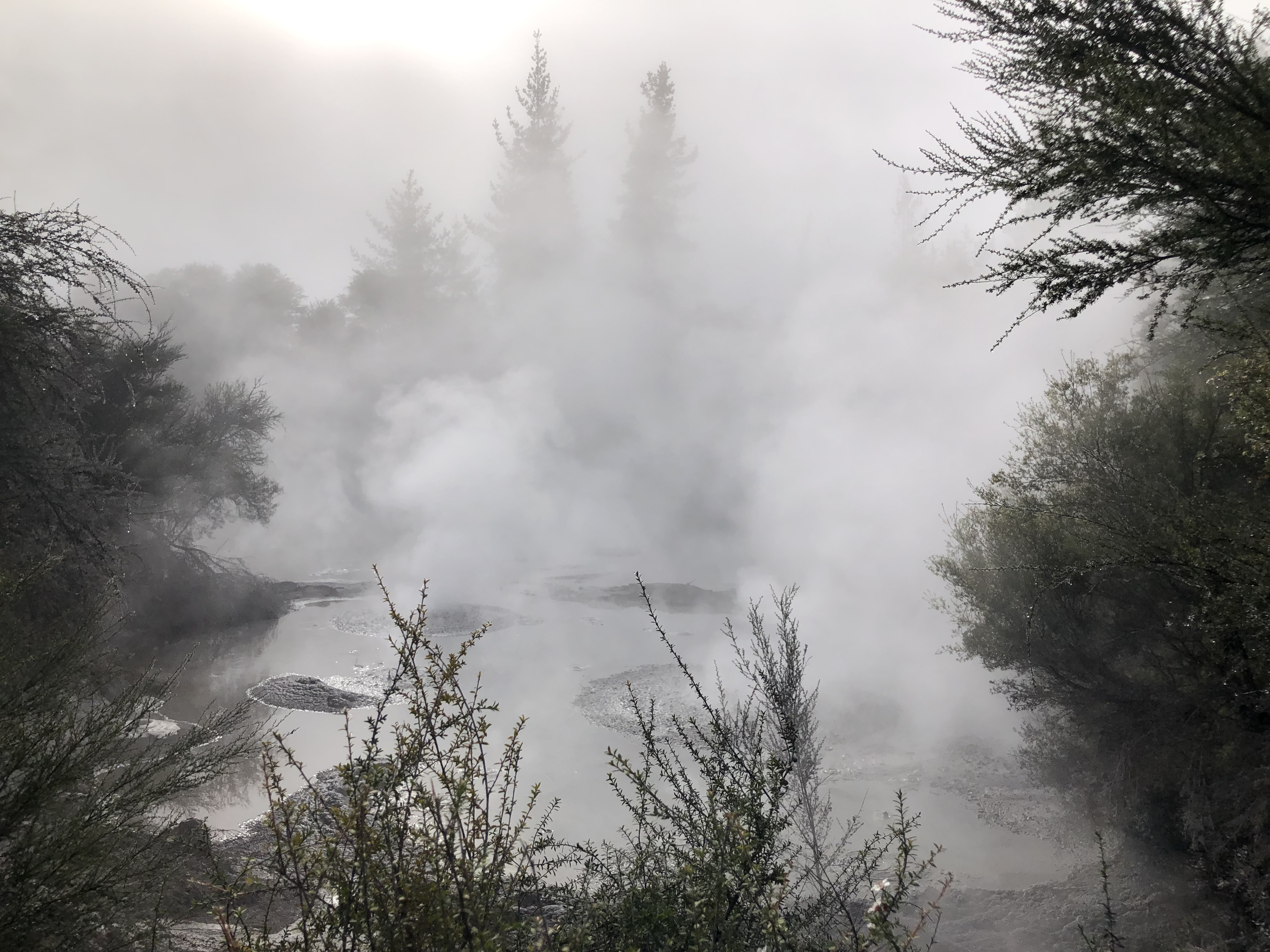 Unser erster Stop, Wai-O-Tapu, das „Geothermal Wonderland“, lag dann auch noch ziemlich verschlafen im Nebel, was nicht so schlimm war, da es eh geschlossen hatte. Aber die Mud Pools konnten wir uns trotzdem anschauen: