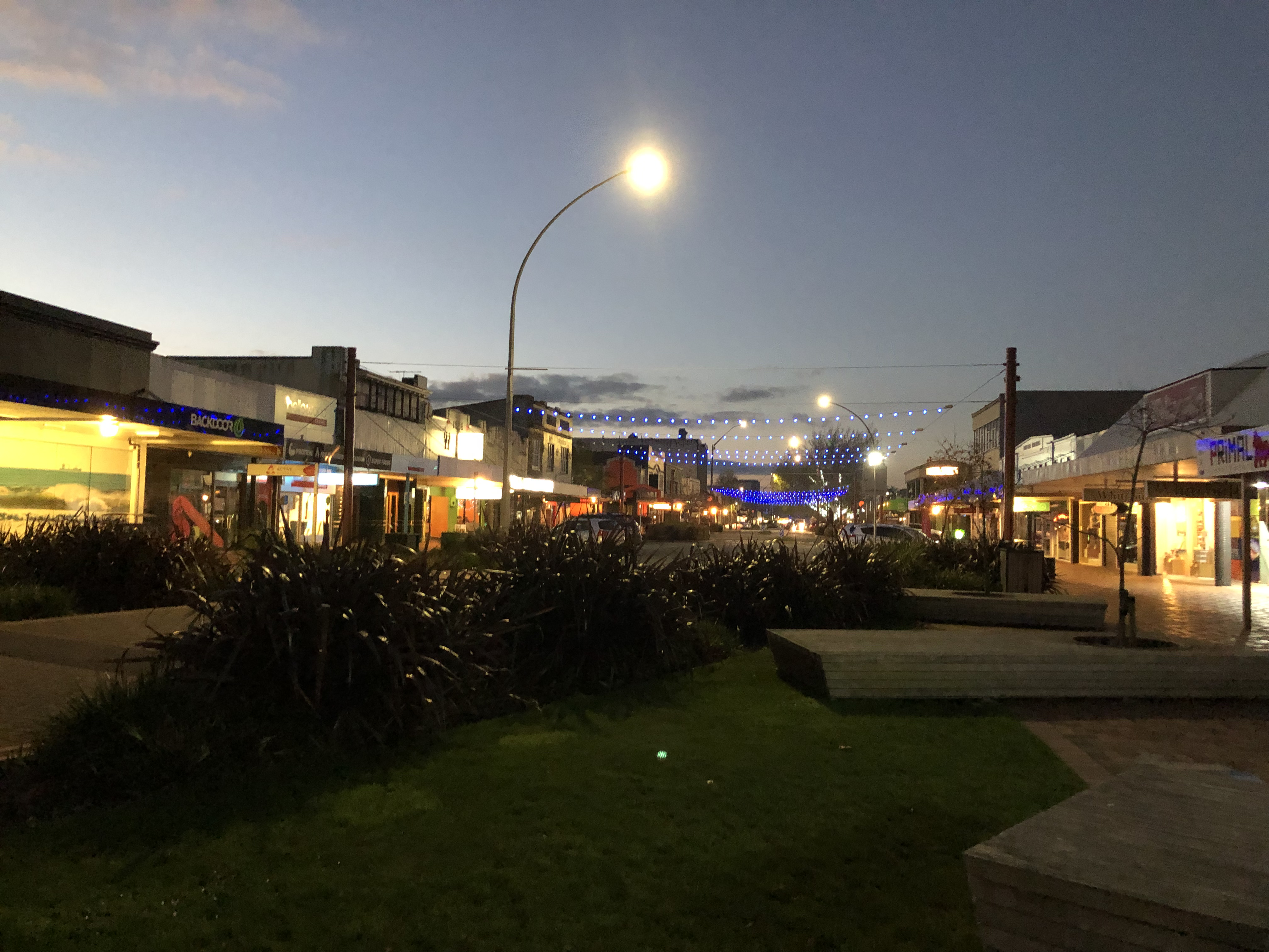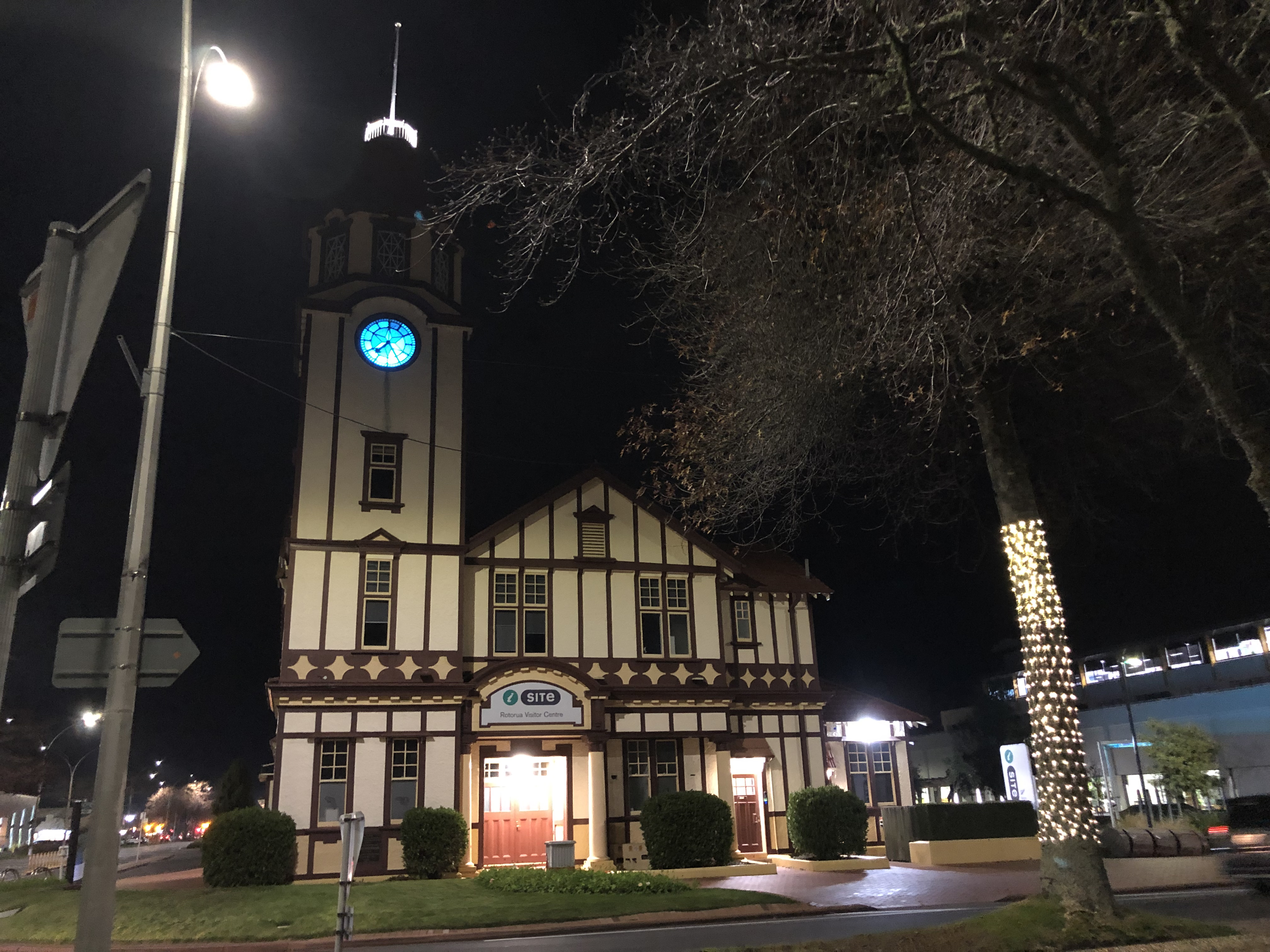 Obwohl wir beide nach unserer langen Wanderung ziemlich k.o. waren, beschlossen wir, noch nach Rotorua hinein zu fahren, um dort nett essen zu gehen, wir waren ziemlich hungrig! Wir parkten das Auto nahe an der Stadtmitte und liefen den Rest des Weges zur „Eat Street“ zu Fuß. Hier ein paar Eindrücke von Rotorua by night: