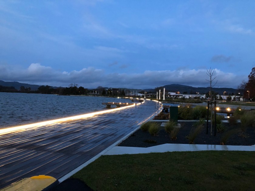 Im Dunklen machten wir uns dann auf den Rückweg zum Auto, nun war der Boardwalk am Seeufer entlang sogar beleuchtet!