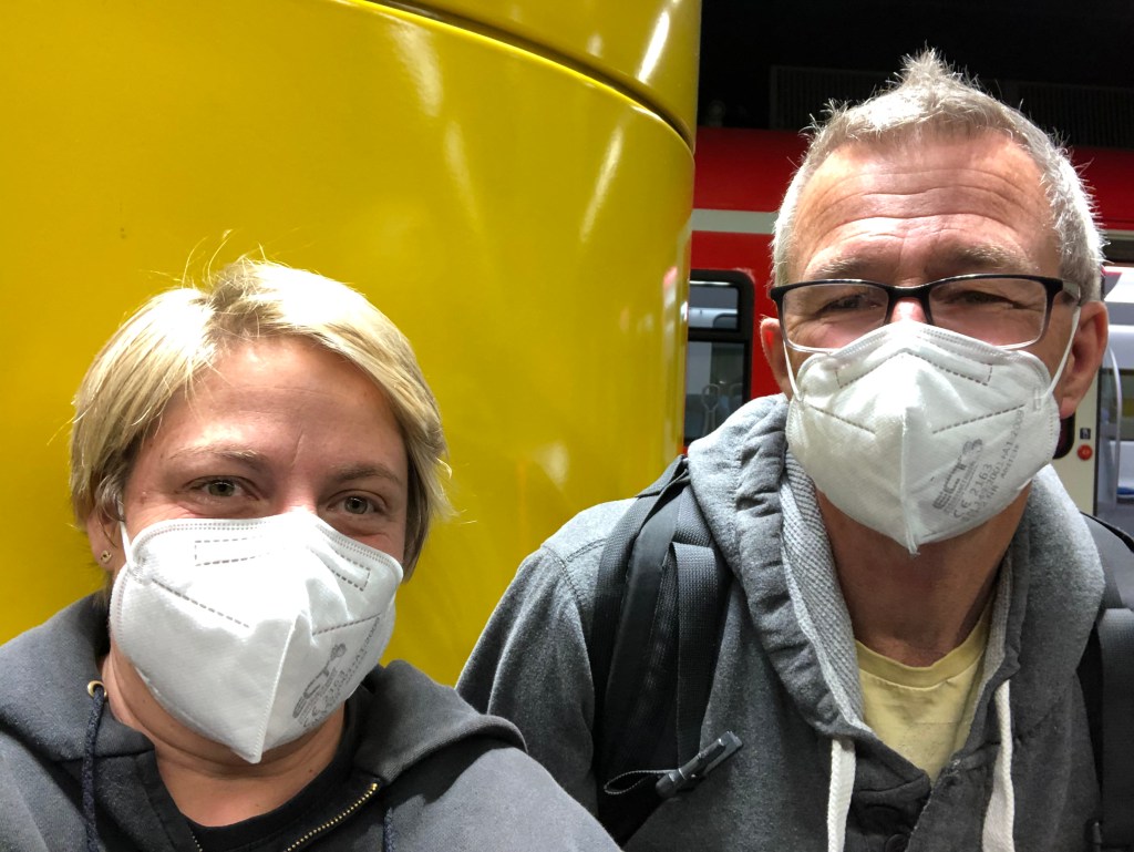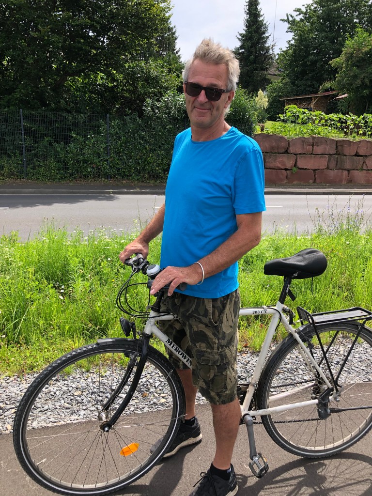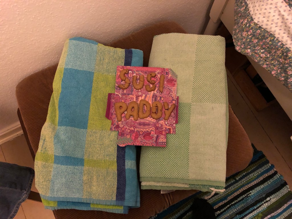 Seit seiner Ankunft vor knapp 10 Wochen hat Paddy sich schon sehr gut akklimatisiert und eingewöhnt: Er übt (mehr oder weniger fleißig) jeden Tag Deutsch mit Duolingo. Für politische Diskussionen reicht es zwar noch nicht ganz, aber er kann inzwischen problemlos dank täglicher Übung auf deutsch beim Bäcker einkaufen – „Mehrkornbrötchen“ und „Muntermacher“ sind fest in sein Vokabular integriert :-). Auch an das Autofahren auf der für ihn falschen Seite hat er sich inzwischen gewöhnt, und ebenso daran, dass er mit rechts schalten muss, das klappt alles wunderbar! Und der Griff zur Maske beim Verlassen des Hauses ist ihm schon in Fleisch und Blut übergegangen. Natürlich vermisst er seine Familie und Freunde und seinen Campingplatz, aber zum Glück gibt es ja das Internet, so dass In-Kontakt-Bleiben (bis auf den Zeitunterschied) kein Problem ist. Aber er genießt sehr, dass er ein anderes Land, seine Sprache und seine Kultur kennen lernen darf, und auch das deutsche Essen (vor allem Brot und Kuchen) haben es ihm angetan. Und natürlich, dass wir eeeendlich wieder zusammen sind.