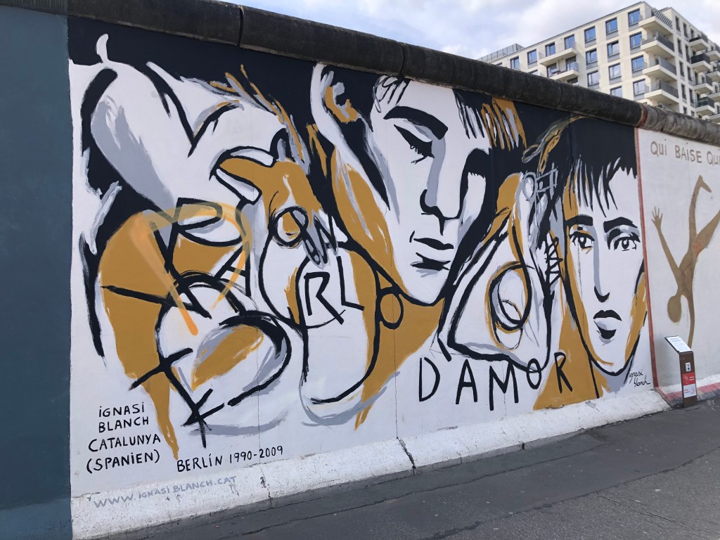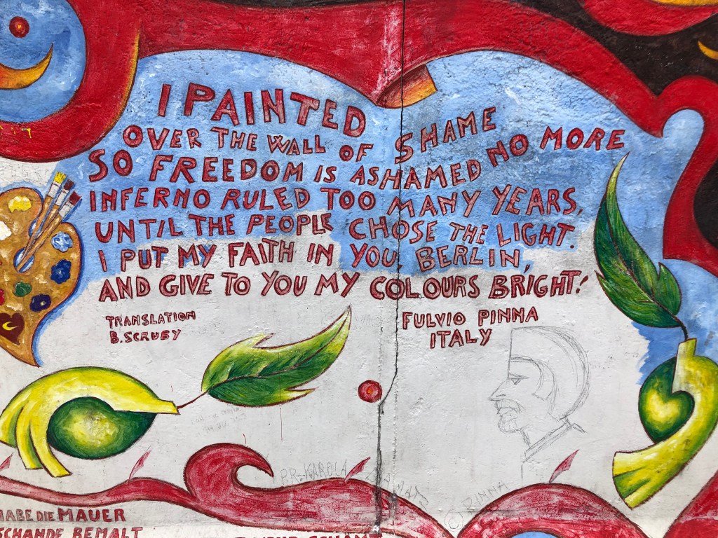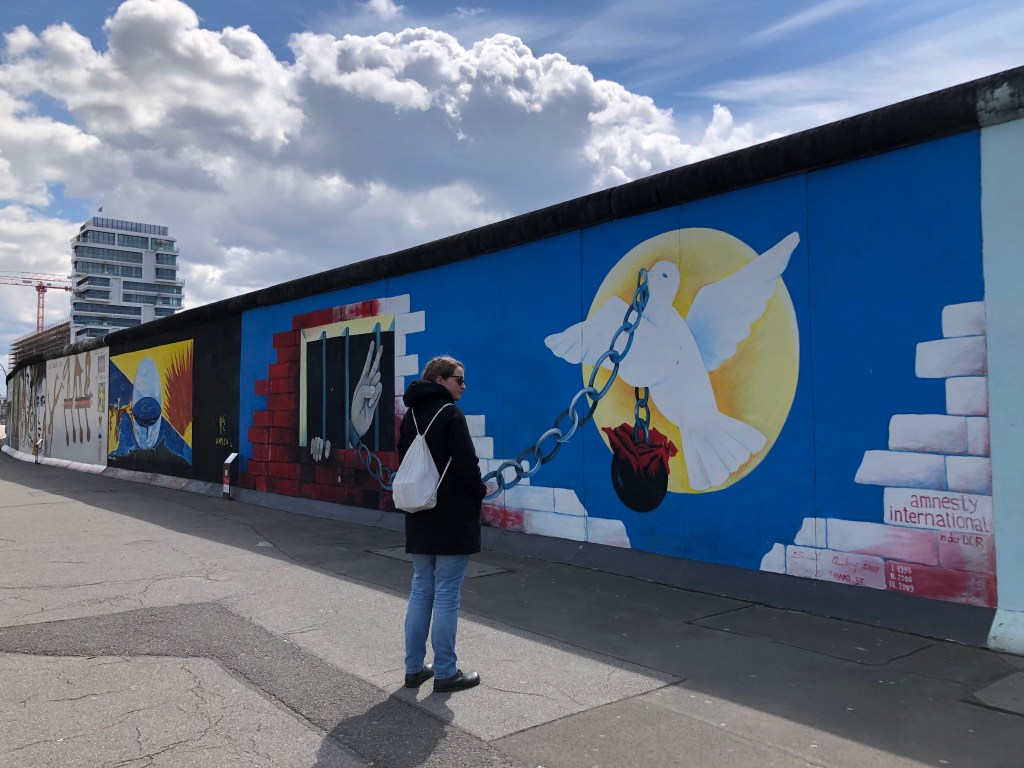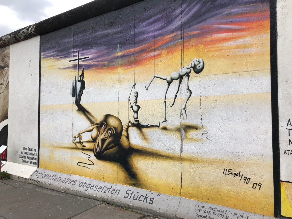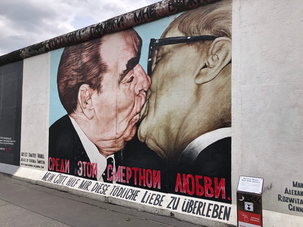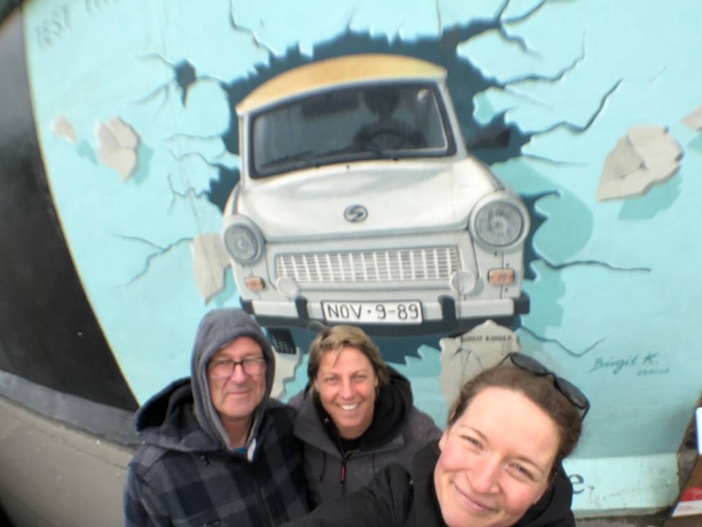 Die Rückseite der East Side Gallery.Anne vor einem der Mauerkunstwerke.Internationale Künstler waren an diesem Projekt beteiligt, das 1990 gegründet wurde – hier das Kunstwerkeines spanischen Künstlers.Auch Kunstwerke zum Gedenken an die dunklen Zeiten waren immer mal wieder dabei.Oder Malerei im Stil bekannter Altmeister.Das ist wohl das bekannteste Bild der East Side Gallery – der Bruderkuss zwischen Honecker und Breschnew. Unsere Botschaft an INZ und die Regierung von Neuseeland! Symbolisch stehen Paddy und ich hier getrennt voneinander.Dieses Bild sah so krass echt aus – mehr wie ein Foto!Botschaft von einem italienischen Künstler.Paddy, Anne und ich vor dem Trabi-Bild.
