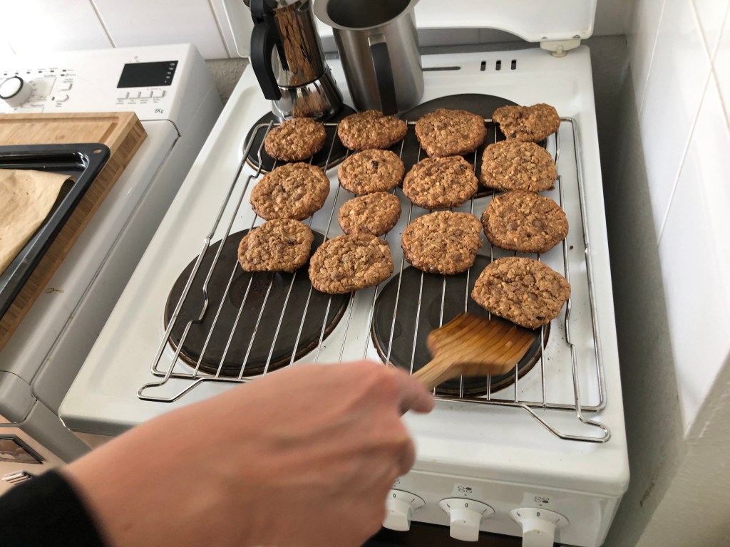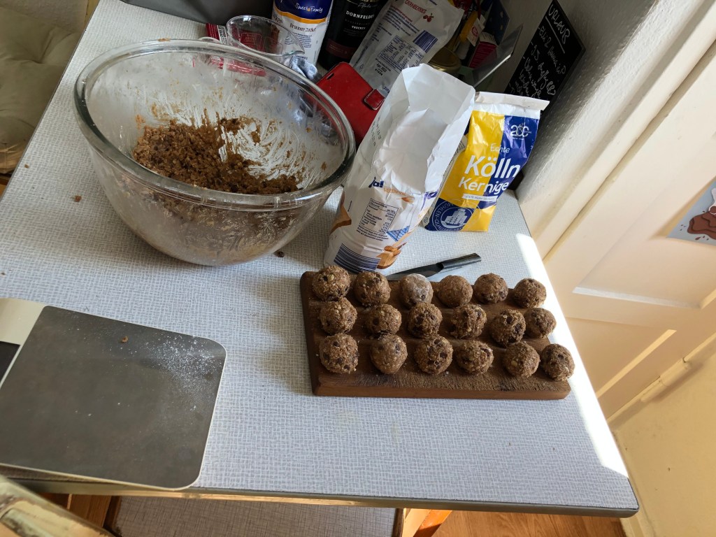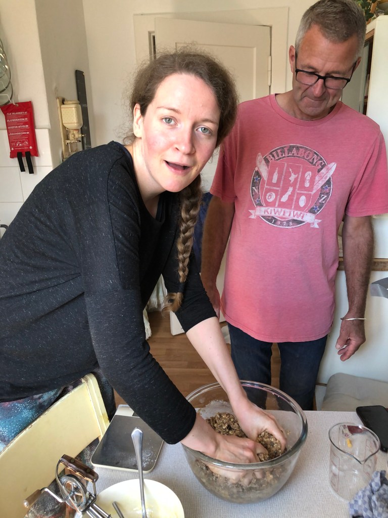 Der Mittwoch war leider schon unser letzter Tag in Berlin, und auch an diesem Tag ließ das Wetter zumindest anfangs zu wünschen übrig, so dass wir zunächst drinnen blieben und neuseeländische Cookies nach Paddy’s Rezept backten: