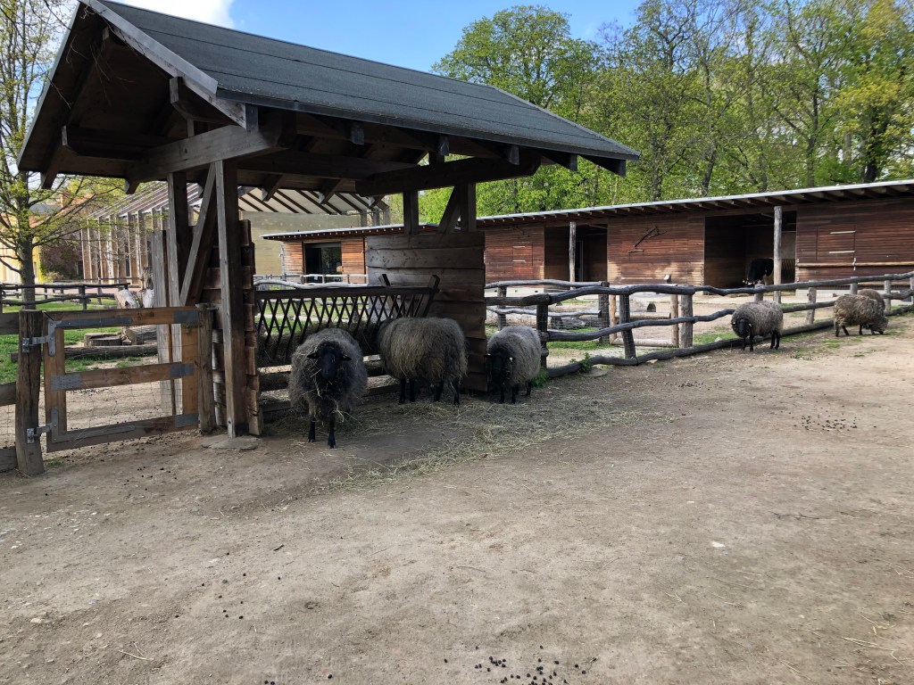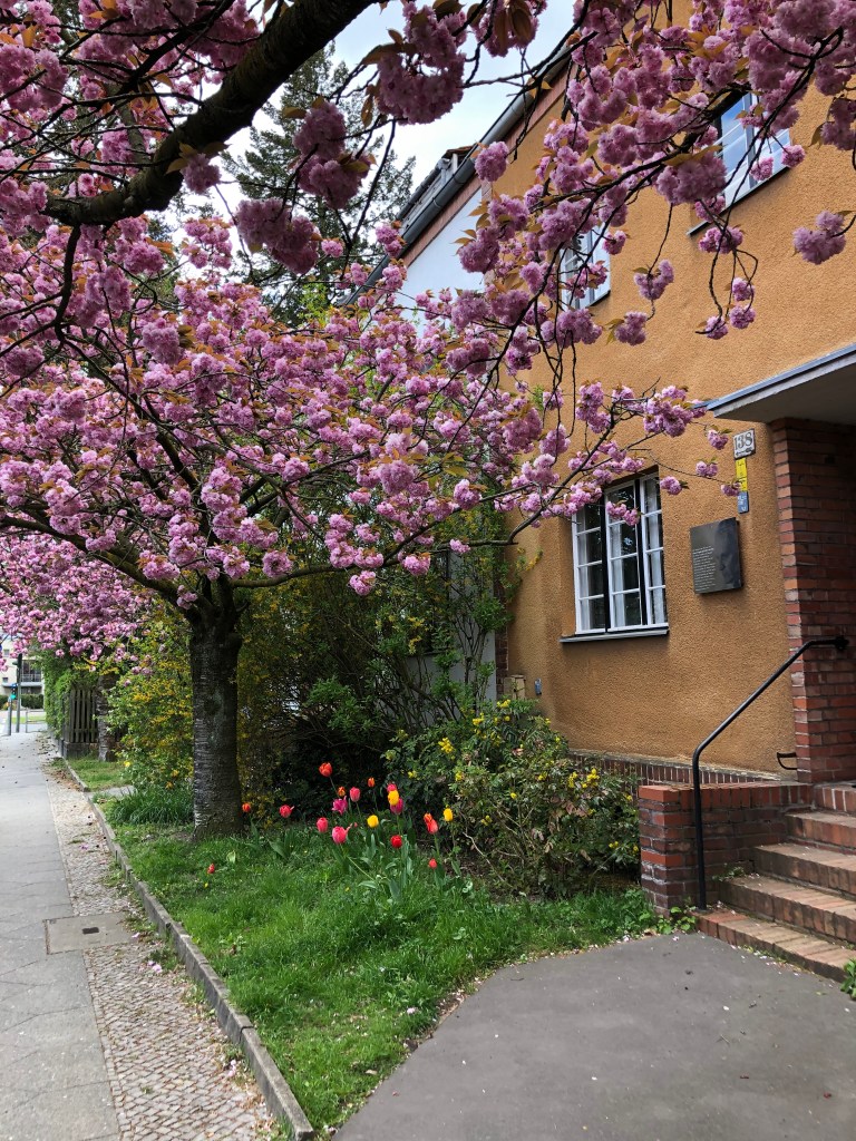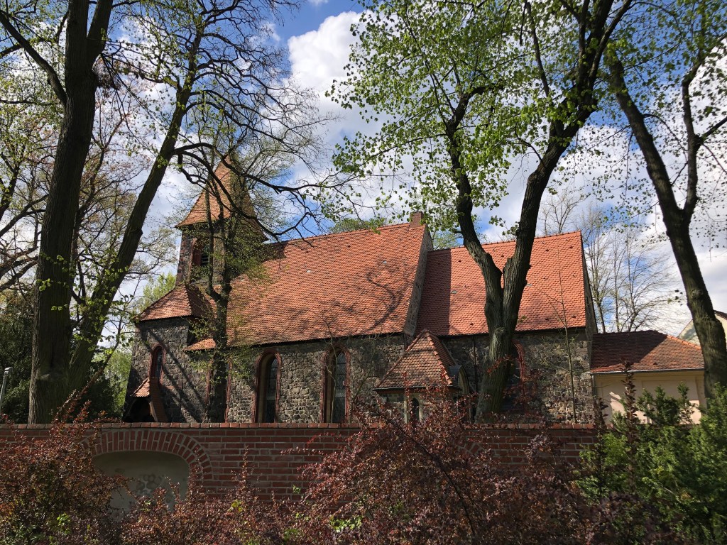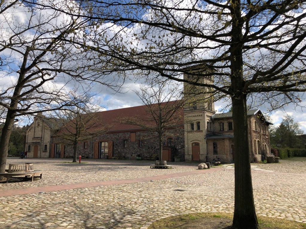 Schafe auf dem Gutshof beim Britzer Schloss.Der Gutshof beim Schloss Britz.Die drei Spaziergänger vorm Schloss.Das Britzer Schloss vom See aus (bzw. das, was man davon sehen kann).Alte Kirche im Park.Blütenpracht entlang der Straße.Anne, Paddy und ich unterm „Kirschblütendach“.