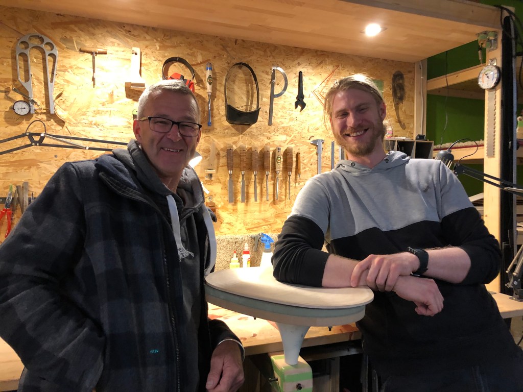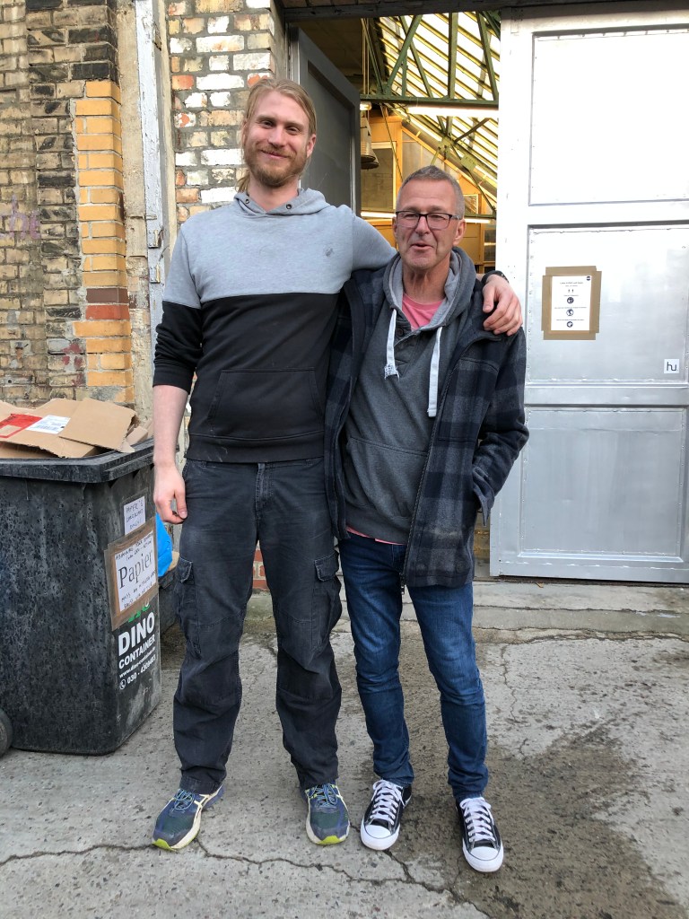 Paddy und Seb in seiner Werkstatt.Paddy schaut richtig klein aus neben Seb 🙂
