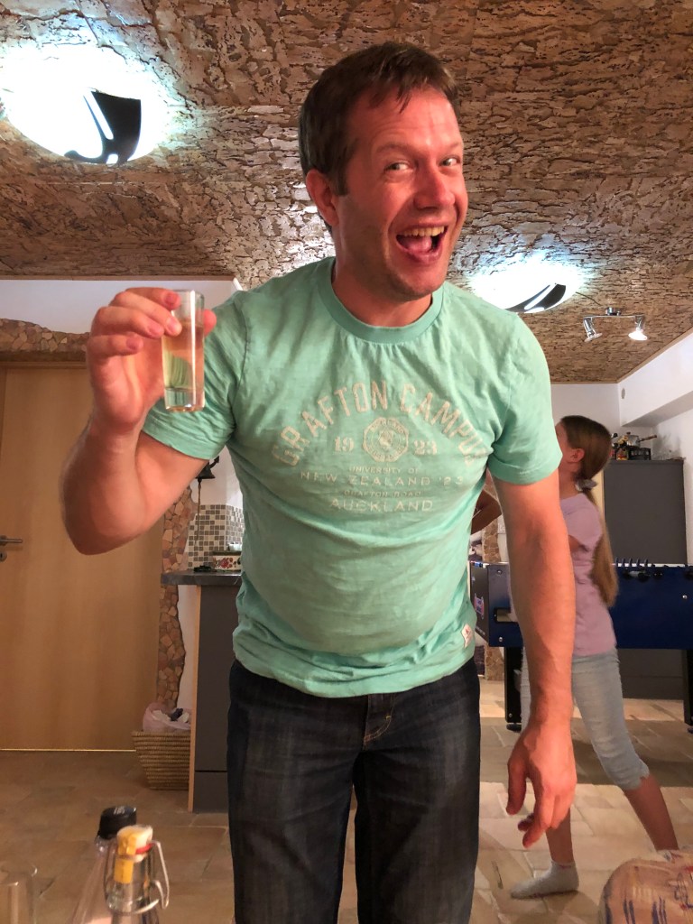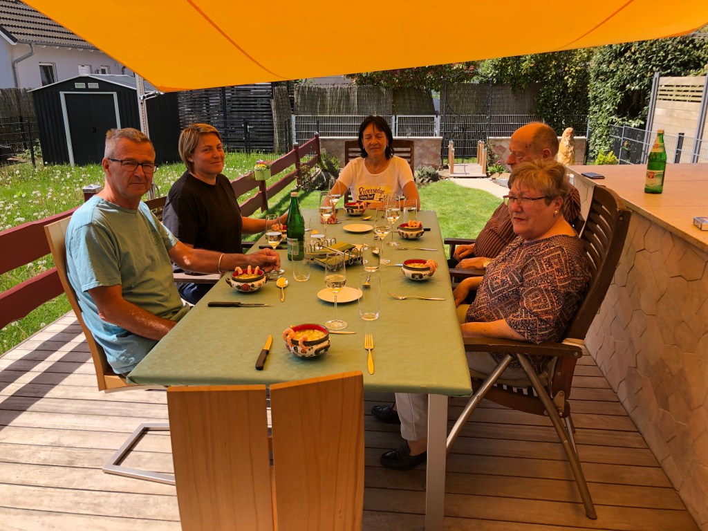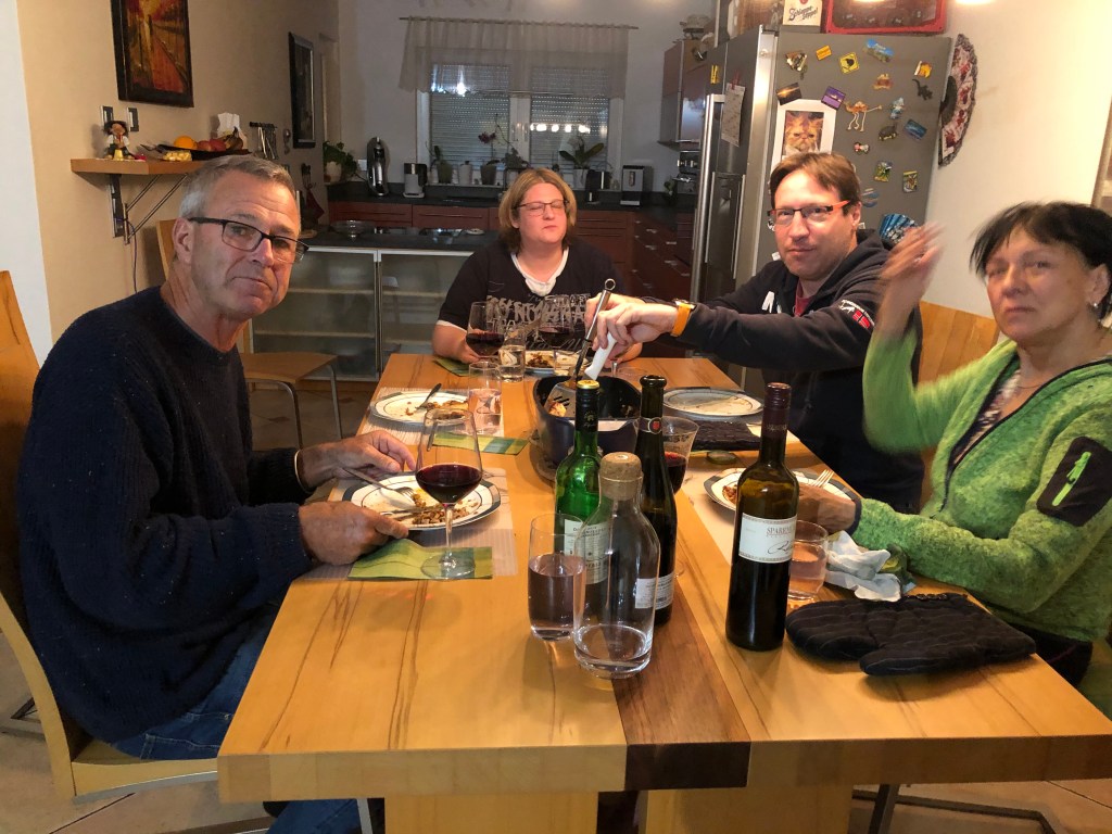Kaum wieder in Kleinostheim angekommen ging es auch gleich weiter zu Thorstens Eltern. Sie hatten uns alle zu einem typisch hessischen Vesper mit Kochkäs, Handkäs mit Musik und Äppler (Apfelwein) eingeladen, sehr lecker! Es war ein sehr schöner Abend mit regem Austausch über die Unterschiede zwischen Deutschland und Neuseeland inklusive ein wenig Geographie mit Globus.