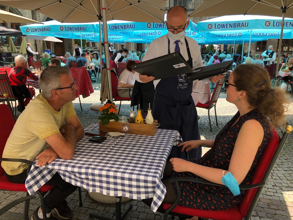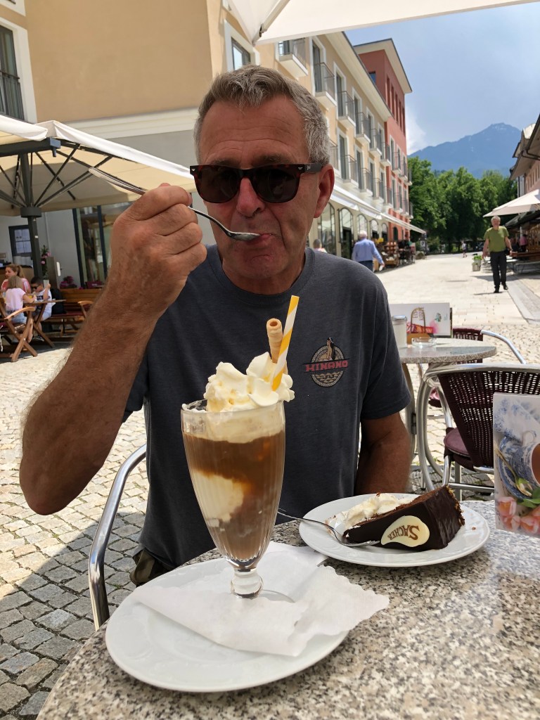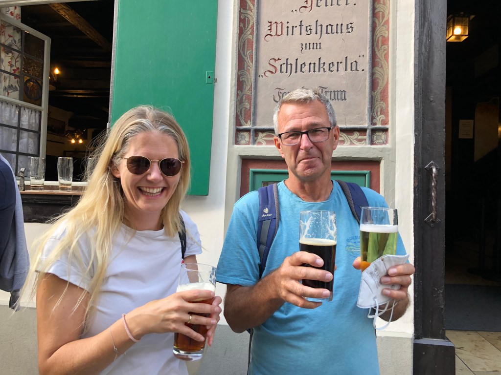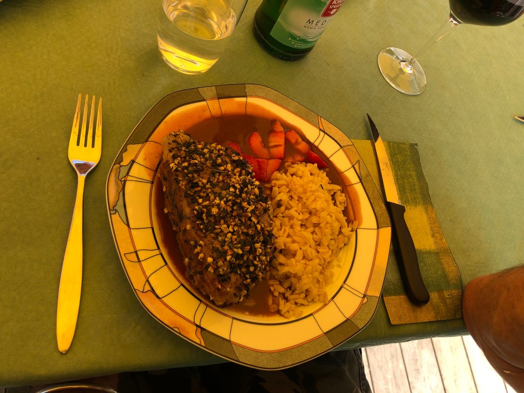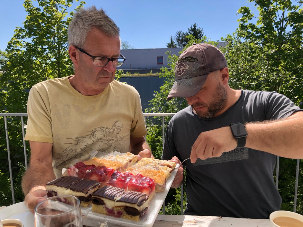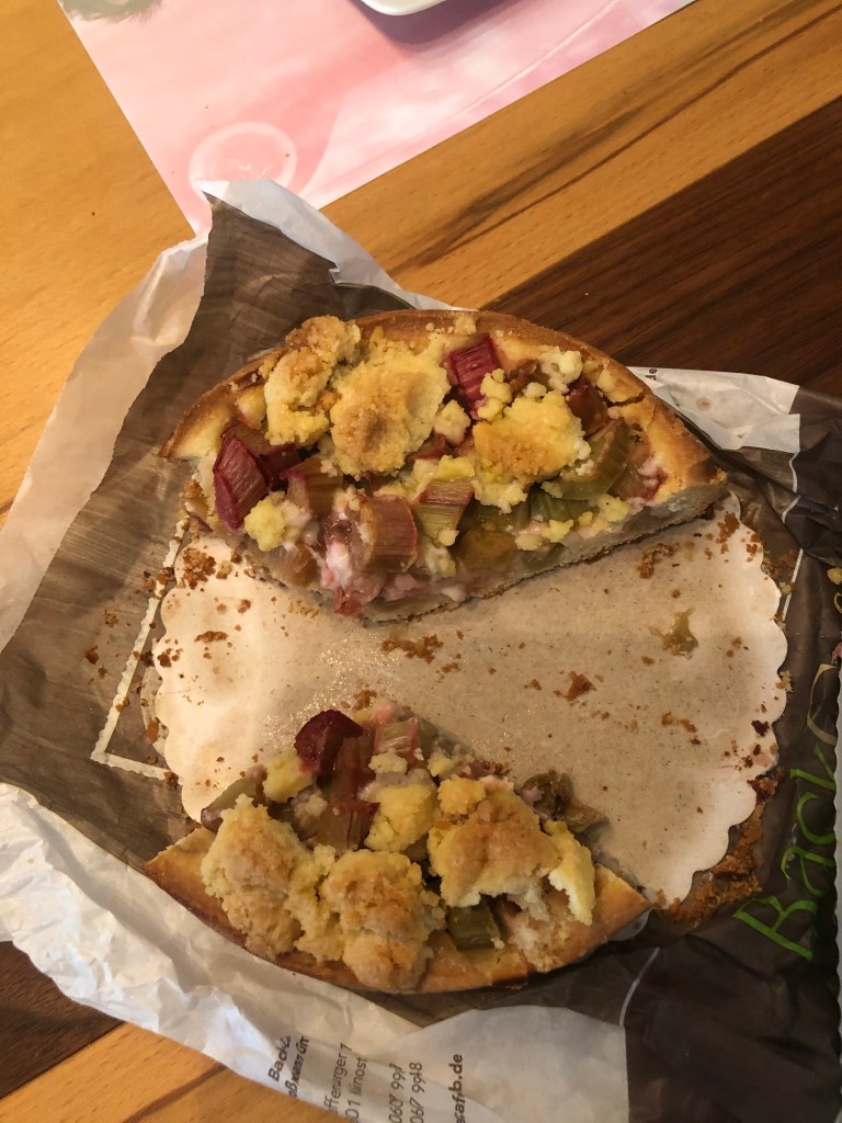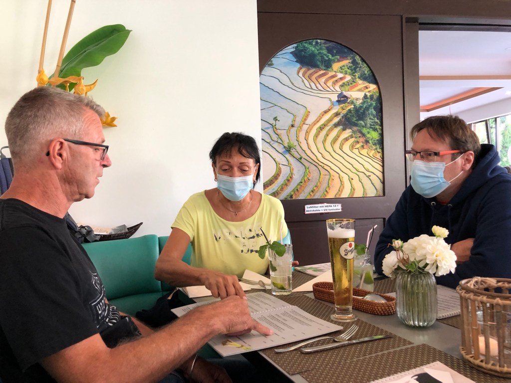 Am Nachmittag waren wir bei Bettina und Jakob zum Kaffeetrinken eingeladen, es gab Paddy’s Lieblingskuchen, von Bettina selbstgebackenen Rhabarber-Streuselkuchen, super-lecker! Außerdem gab es für mich die neuesten Geschichten aus der Schule, die ich in Corona-Zeiten wirklich nicht vermisse, das Unterrichten zu normalen Zeiten allerdings schon… Abends hatte Bettina einen Tisch beim Schinkenpeter reserviert, und wir ließen uns das leckere Essen dort schmecken: