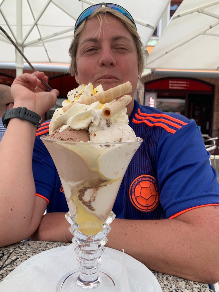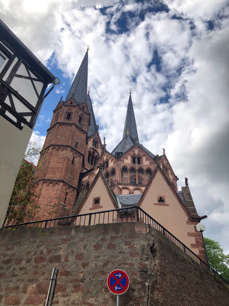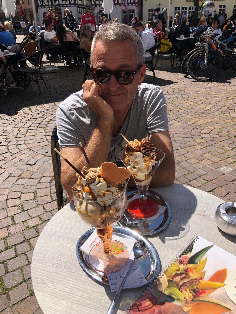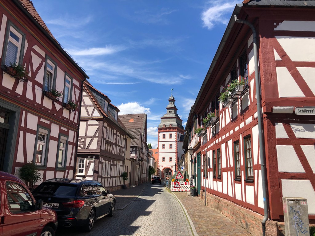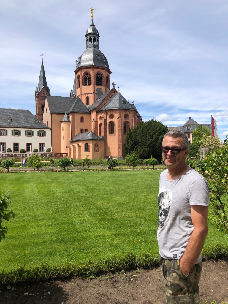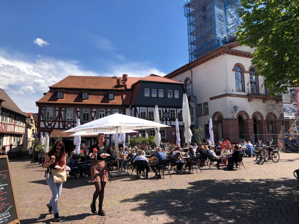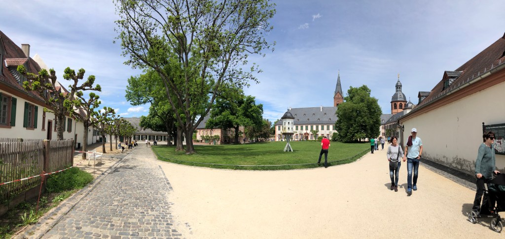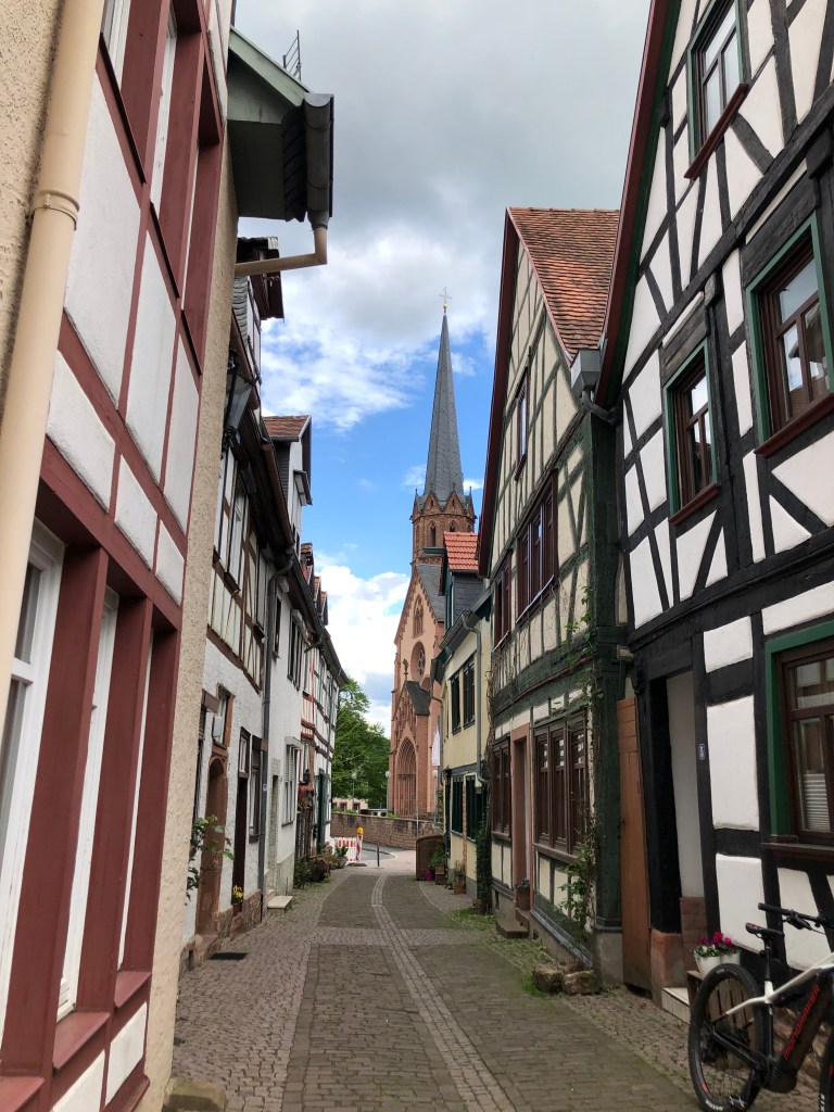 Am Pfingstmontag wurde das Wetter endlich mal wieder besser – der Regen hörte auf, die Sonne kam raus und auch er Wind ließ nach. So beschlossen Paddy und ich, eine Radtour nach Seligenstadt zu machen. Natürlich war es schon am Main entlang recht voll, wir waren nicht die einzigen, die diese Idee hatten, aber Seligenstadt selbst war dann richtig voll! Und man hätte meinen können, dass es Corona nicht mehr gibt: alles voller Menschen, keine Maskenpflicht mehr in der Innenstadt und man konnte tatsächlich in Cafes, Restaurants und Eisdielen draußen an Tischen sitzen, ohne Test und ohne Mundschutz! Anfangs fand ich das zwar etwas unheimlich, aber wir genossen unseren großen Eisbecher dann doch sehr!! Es fühlte sich fast wieder an wie zu normalen Zeiten! Aber wir aßen nicht nur Eis, wir schauten uns auch den Ort ein wenig an (siehe auch Titelbild), jedenfalls so lange bis schwarze Wolken am Horizont mit Regen und Gewitter drohten! Dann schwangen wir uns schnell auf unsere Räder, radelten zurück und schafften es tatsächlich trockenen Fußes nach Hause 🙂