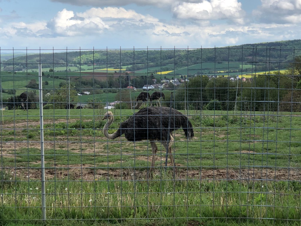 Den regenfreien Sonntag nachmittag nutzten Paddy und ich zu einem Ausflug zur Straßenfarm Tannenhof bei Schaafheim. Zuerst besichtigten wir den Hofladen und kauften leckeres Straußenfleisch, dann schauten wir uns die Tiere live an – echt beeindruckend mit ihrer Größe! Auch die Aussicht von dort kann sich sehen lassen, man kann bei klarem Wetter sogar die Skyline von Mainhatten (Frankfurt) sehen, heute war sie jedoch nur zu erahnen…