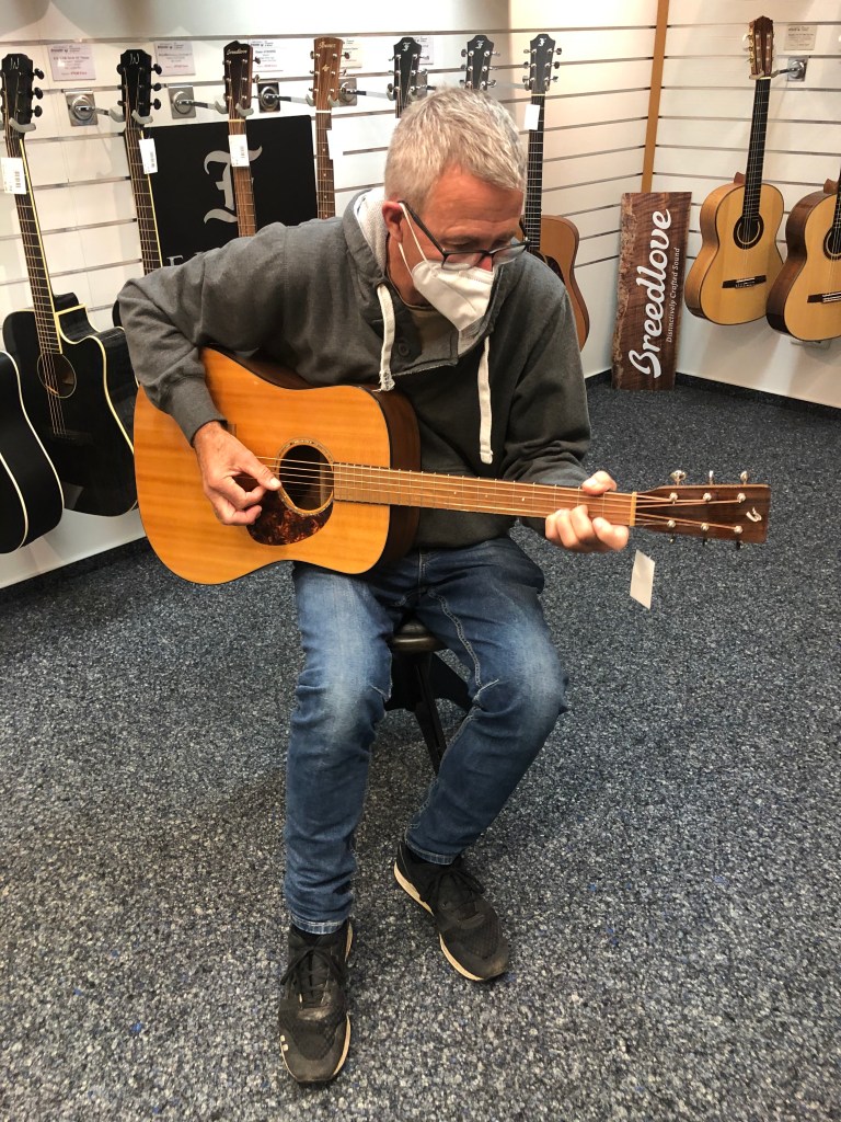 Am Mittwoch nutzten wir die sinkenden Coronainzidenzen zu einem Click-and-meet-Termin in einem Aschaffenburger Musikgeschäft, für den man jetzt keinen negativen Test mehr braucht. Wir verbrachten dort fast zwei Stunden, wurden hervorragend beraten und Paddy probierte sämtliche Breedlove-Gitarren aus, die er in die Finger kriegen konnte. Wie durch ein Wunder verließen wir den Laden ohne eine einzige Gitarre 😉