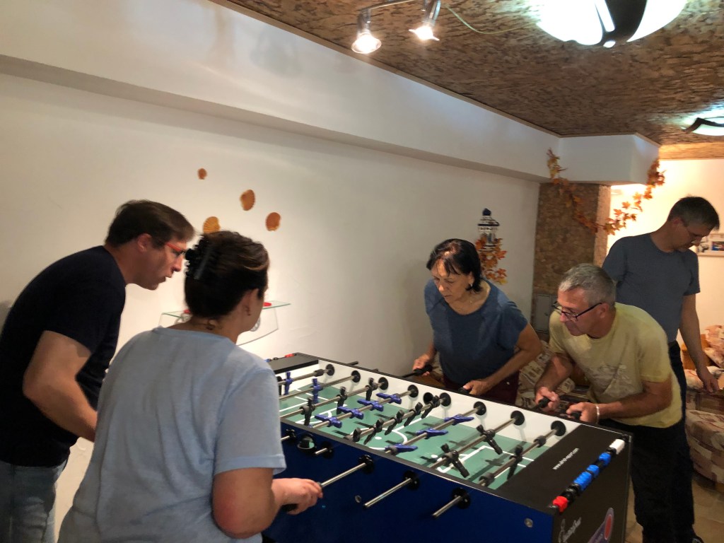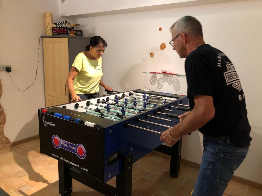 Zum Glück waren wir dieses Mal früh fertig, so dass wir noch genügend Zeit hatten zu duschen und uns etwas auszuruhen, bevor Dieter und Vera zum Abendessen und anschließendem Kickern/Darten kamen. Obwohl wir ziemlich k.o. waren, spielten wir trotzdem noch ein paar Stunden, und hey, ich werde echt besser im Kickern, yayyy!