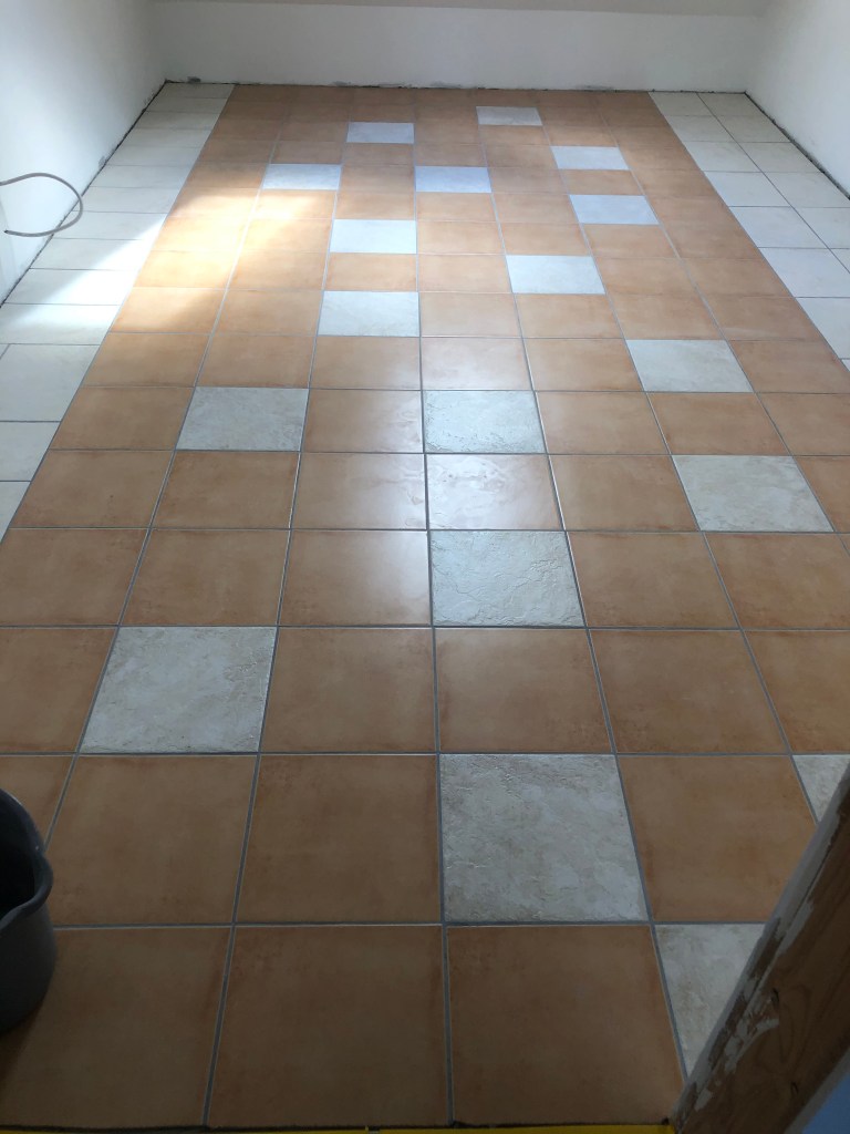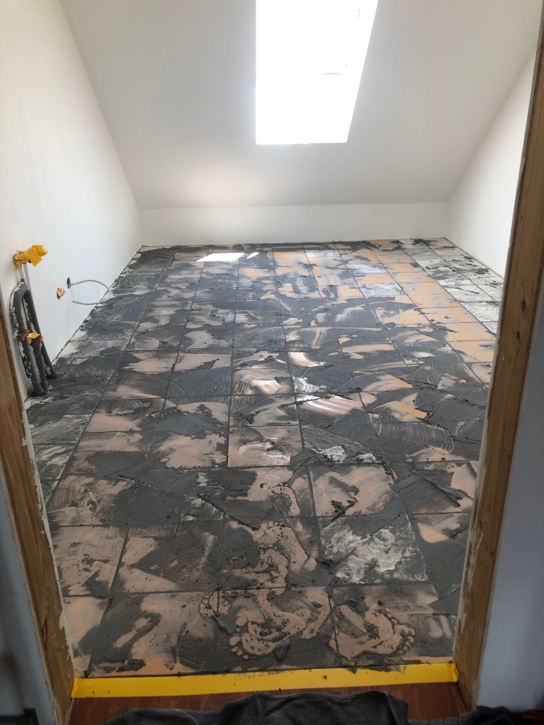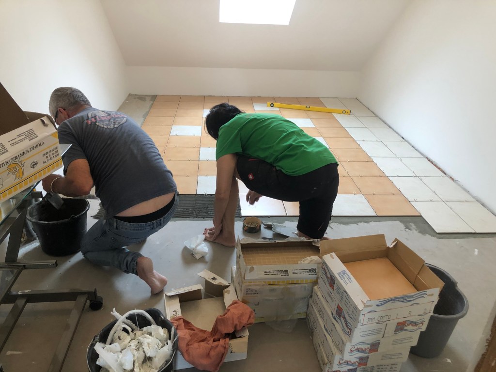 Danach ging es mit Streichen weiter, das war Paddy und mein Job – deshalb habe ich leider keine Bilder davon, ich war so mit Streichen beschäftigt ;-). Inzwischen sind wir beim Fliesenlegen angekommen, und während ich hier gerade gemütlich meinen Blog schreibe, arbeiten Claudi und Paddy fleißig am Fußboden: