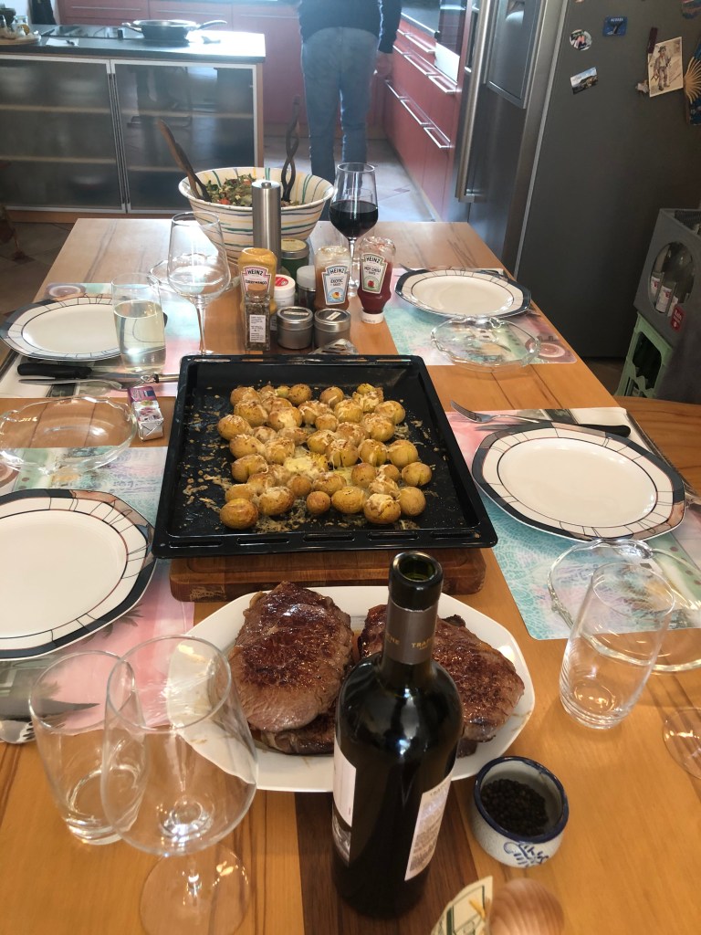 Paddy beim Cookies-Backen.Das fertige Produkt konnte sich echt sehen (und essen) lassen!Sheperd’s Pie nach Paddy’s Rezept.Gestern gab es Steaks mit gerösteten Käse-Ofen-Kartoffeln und Salat (für den war ich zuständig).