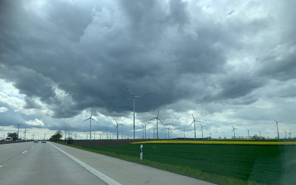 Windpark vor Leipzig, von der Autobahn aus gesehen, zusammen mit dunklen Wolken.