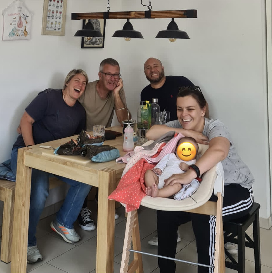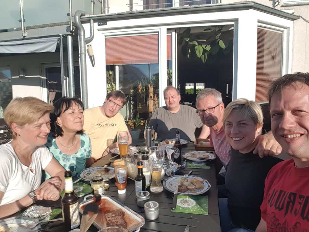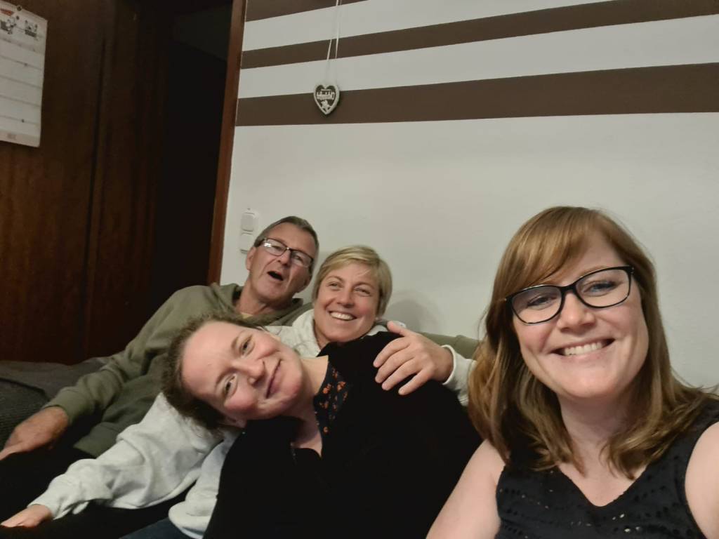 Papa und Elke.Paddy, Claudi und Thorsten, mit Mundschutz, weil sie sich irgendwas eingefangen hatten und uns nicht anstecken wollten.