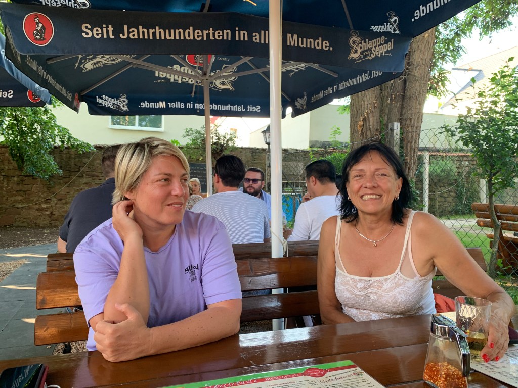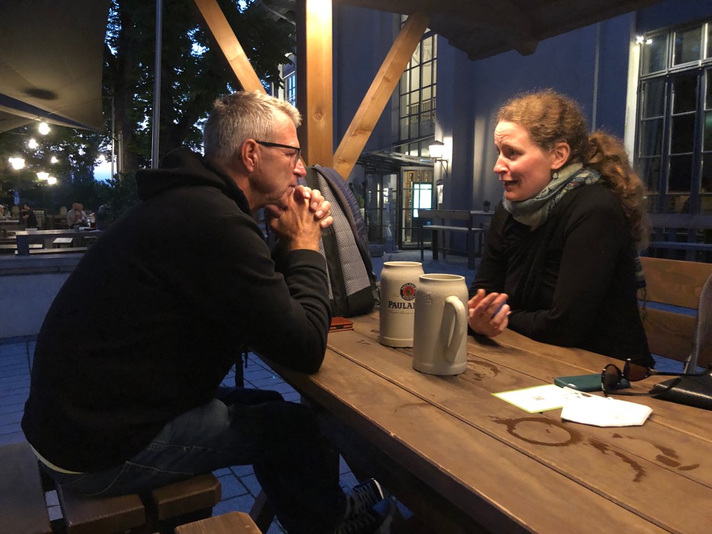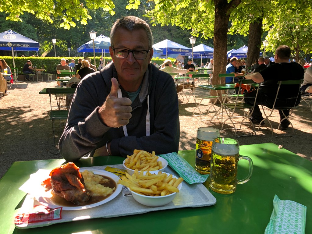 Jörg und Paddy bei Essen und Trinken im Hirschgarten.