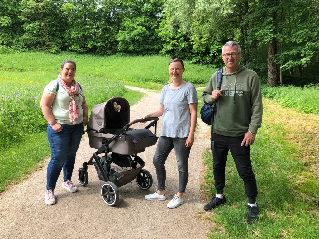 Paddy und ich mit Tanja und Nadine bei unserem Spaziergang.Die neue stolze Mama mit Kinderwagen (und Kind), umrahmt von Nadine und Paddy.