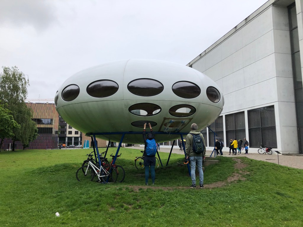 Pinakothek der Moderne.Anne und Paddy begutachten das „Ufo“ im Garten.