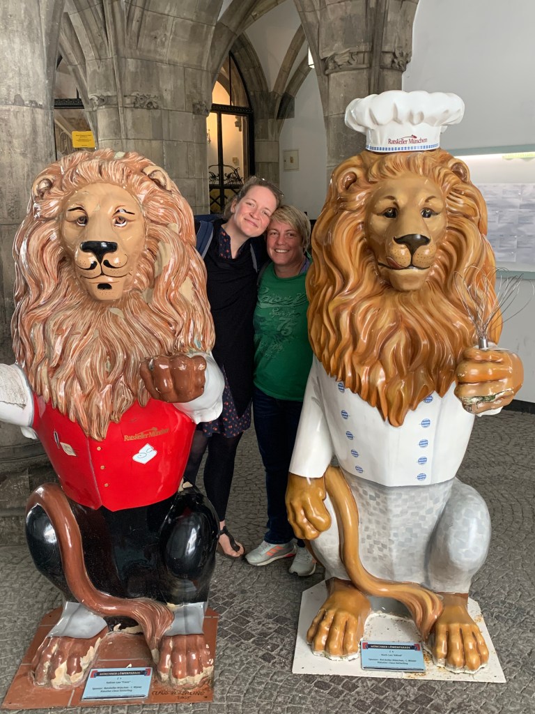 Paddy und Anne warten auf die Speisekarte.Erinnerungsbild mit bayerischen Löwen im Rathaus-Innenhof.