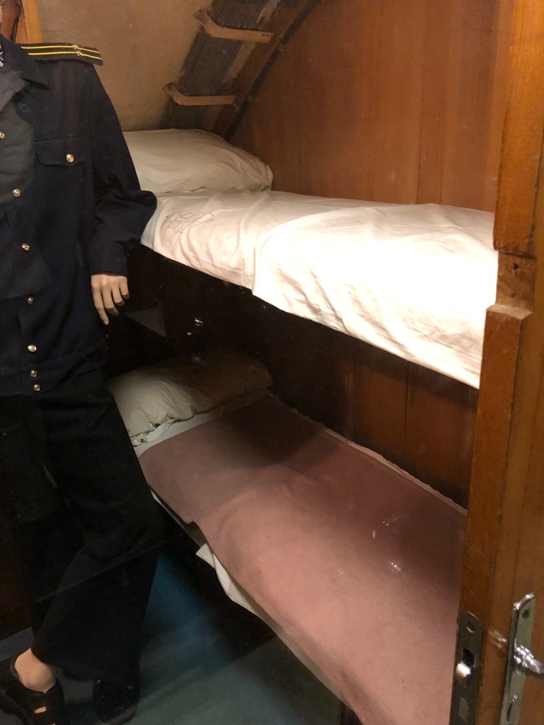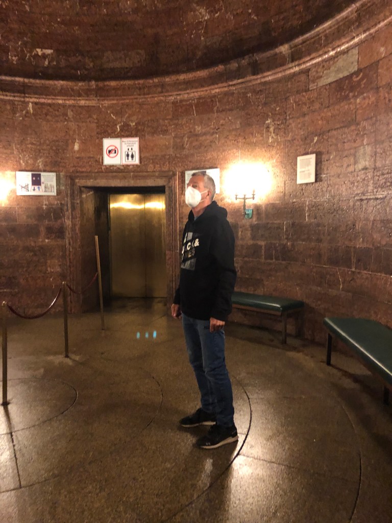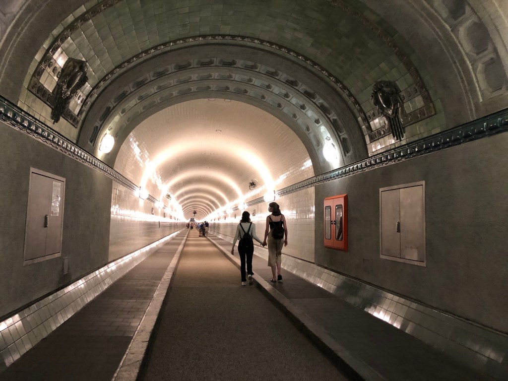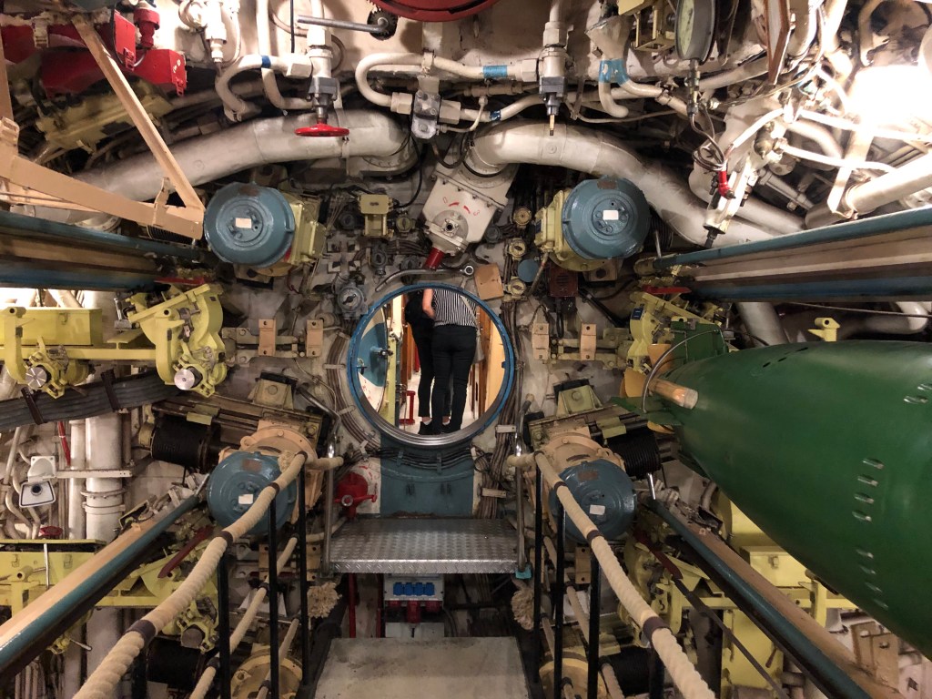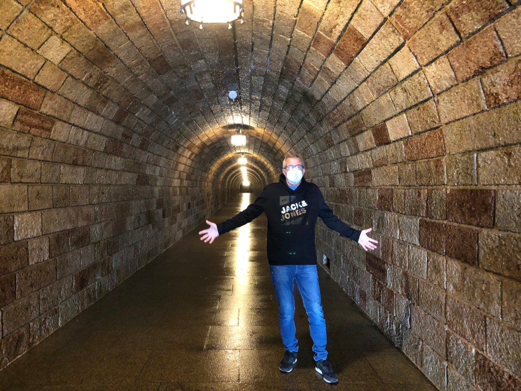 Paddy und ich im Sightseeing-Bus – natürlich mit Maske, auch wenn die meisten Gäste leider eine Extraaufforderung des Busfahrers brauchten.Unterwegs durch Hamburg mit offenem Dach – und voll besetzt.Das deutsche Schauspielhaus.Das alte Wahrzeichen Hamburgs – der „Michel“ (die St. Michaeliskirche).Paddy am Eingang zur berühmt-berüchtigten Herbertstraße.Die Herbertstraße am Vormittag – nicht sehr aufregend…Die Reeperbahn.Paddy vor „meinem“ Club – das war zu gut, um kein Foto zu machen 😉Der Hamburger Fischmarkt bzw ihre Halle, leider gerade wegen Corona geschlossen, aber trotzdem ein schönes Gebäude.Blick zum Hamburger Hafen und seinen vielen Kränen.Das russische U-Boot von 1976, das man besichtigen kann – das ließen wir uns natürlich nicht entgehen!Und so sah es von innen aus – jede Menge Kabel, Maschinen und null Luxus, außerdem alles wahnsinnig eng und klein……alles natürlich hochmodern! 😉… mit lauschigem Örtchen…… ziemlich engen Kojen ohne jegliche Privatsphäre… das wäre definitiv nichts für mich!Nach der klaustrophobischen Enge brauchten wir erstmal eine Stärkung an der frischen Seeluft! Natürlich wie sich das für Hamburg gehört mit Fischbrötchen.Ich ohne Fischbrötchen, aber dafür mit Elbphilharmonie im Hintergrund.Der Eingang zum alten Elbtunnel, den man nur noch als Fußgänger bzw. mit dem Fahrrad benutzen kann.Auch innen sehr beeindruckend! Hier die Treppen, die in die Tiefe führen.Und hier die gemütliche Variante – der Aufzug.Und so sieht es dann im Tunnel aus.Die Landungsbrücken.