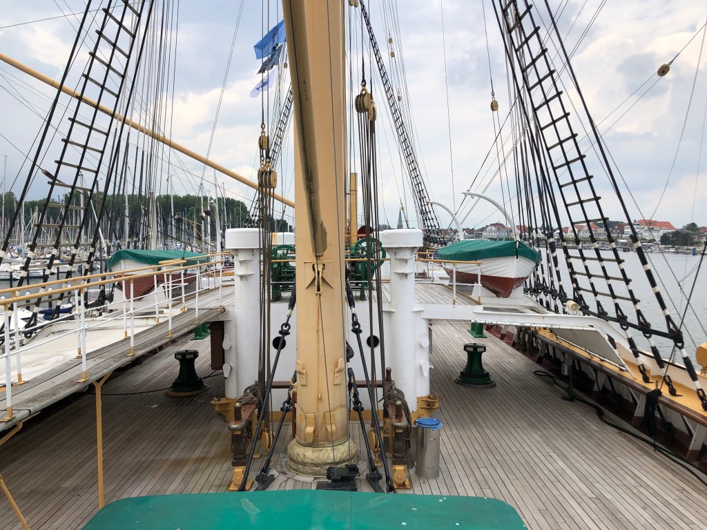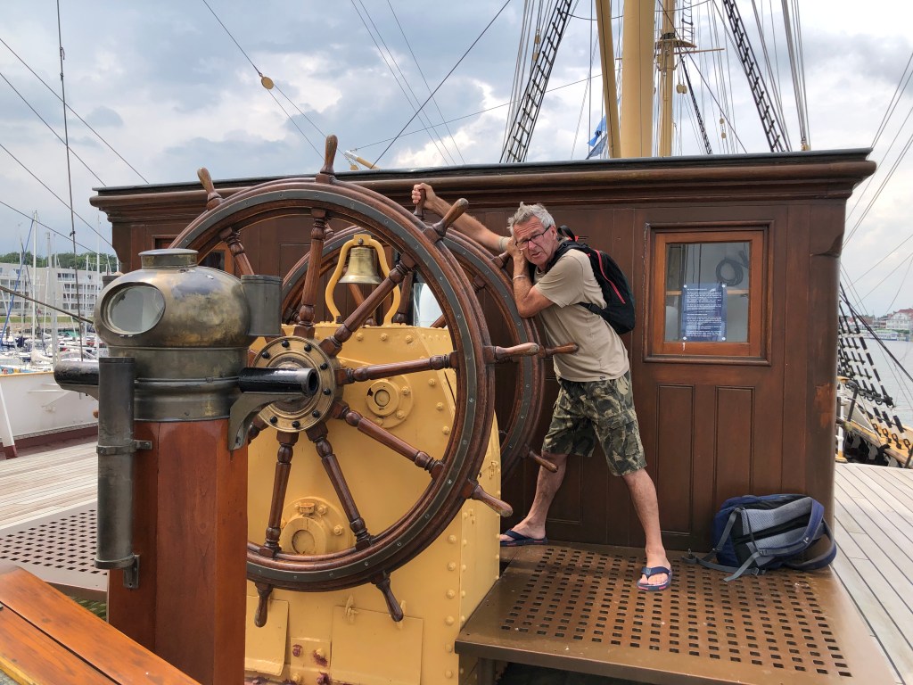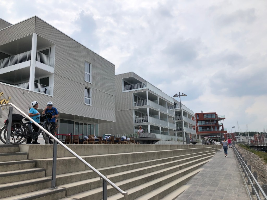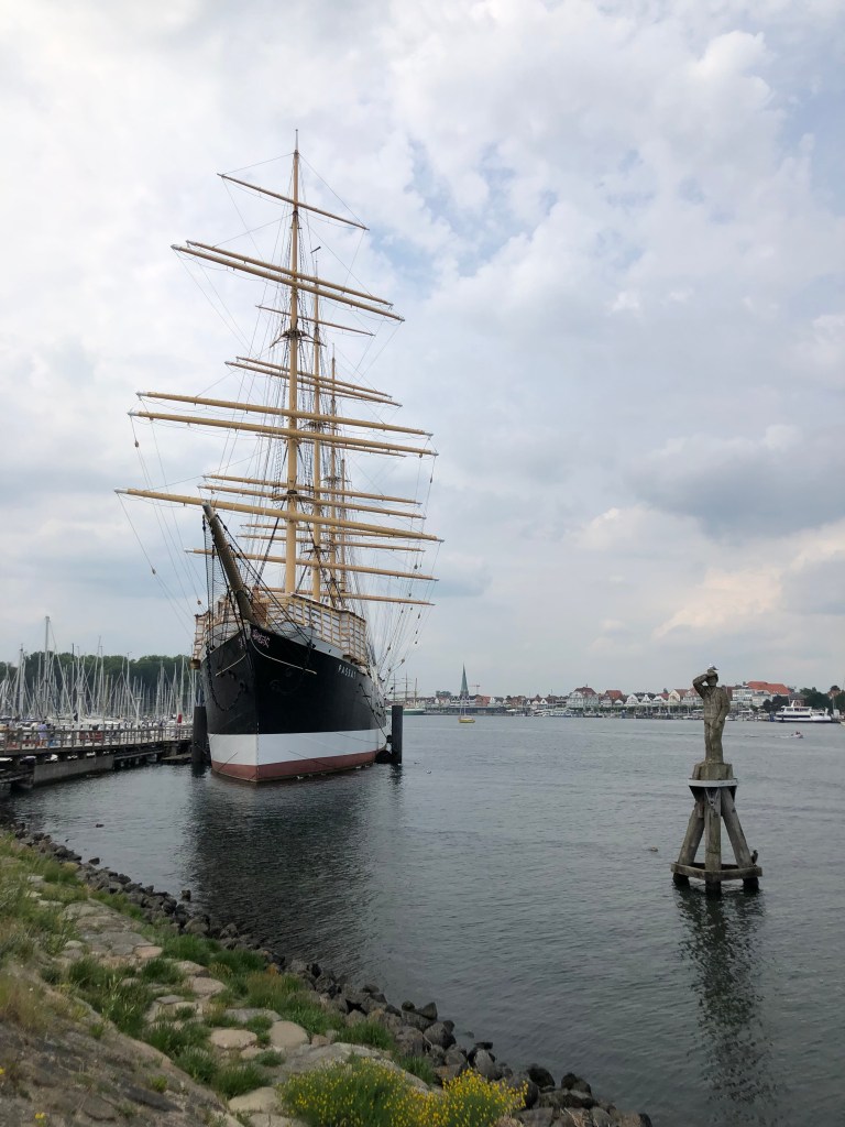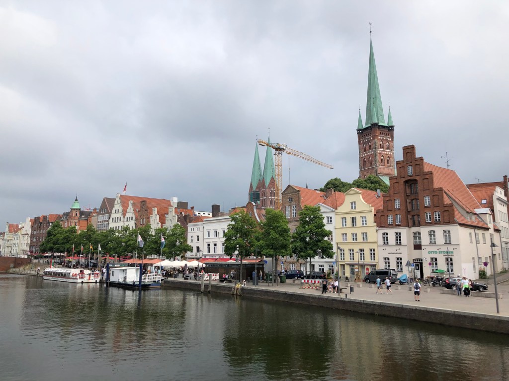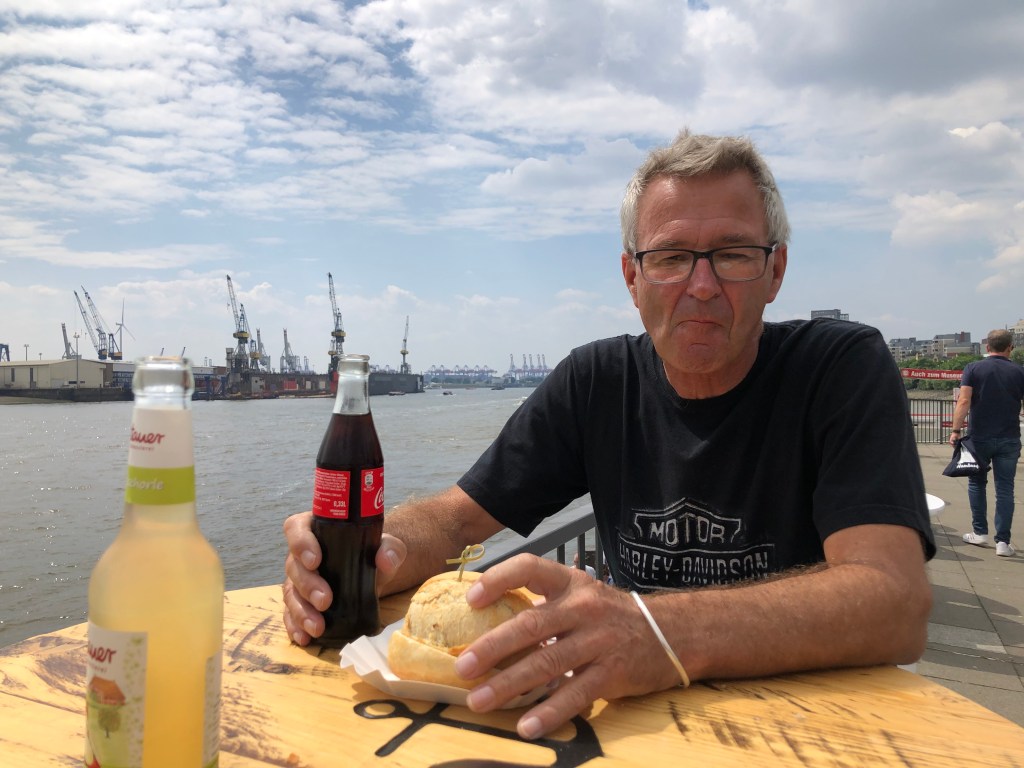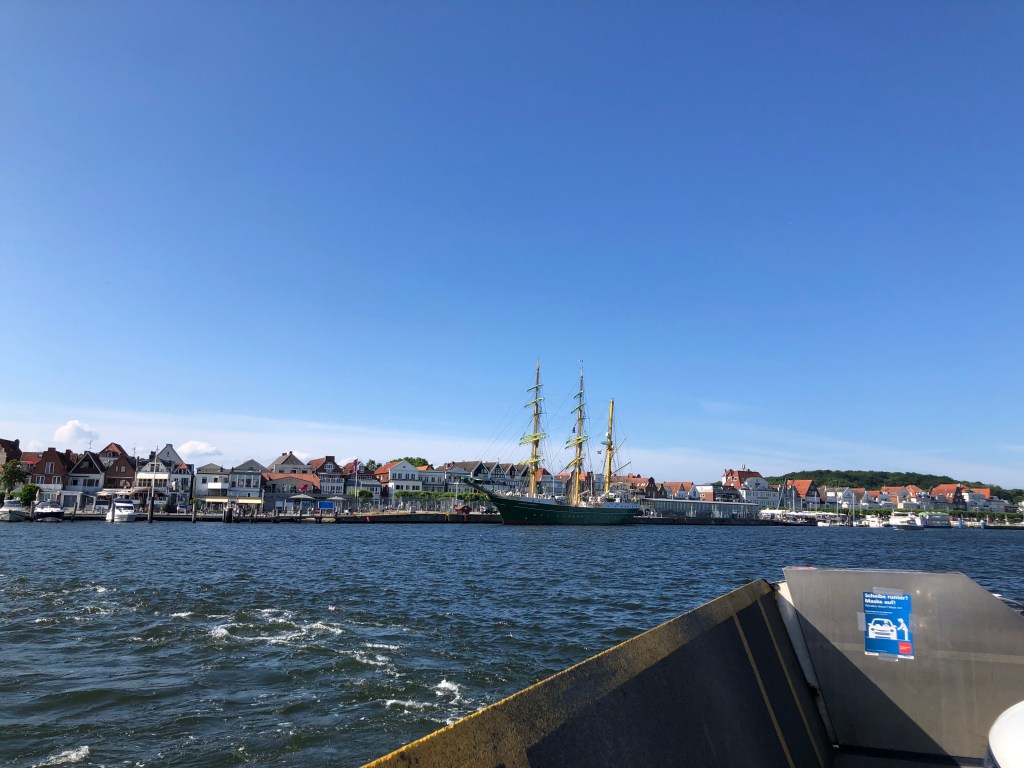 Dummerweise hatten wir Helden natürlich unsere Sonnencreme vergessen, so dass wir nicht so lange bleiben konnten, um keinen Sonnenbrand zu kriegen. So beschlossen wir, am Nachmittag nach Priewall zu fahren, mit der Fähre nach Travemünde überzusetzen und uns den Ort ein bisschen anzuschauen. Bei der Gelegenheit organisierten wir uns natürlich auch gleich unser Abendessen – mit Blick auf die Trave.