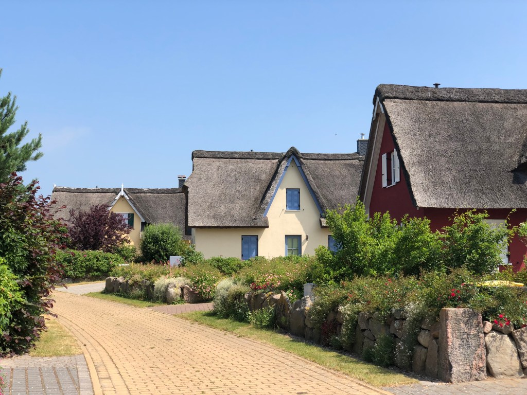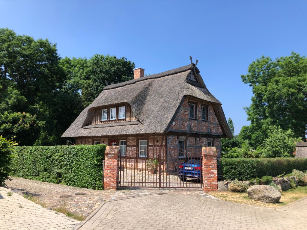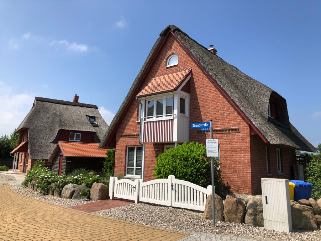 Am nächsten Tag brachen wir nach einem guten Frühstück mit Müsli und Obst zuhause auf zum nächstgelegenen Strand. An der Ostsee muss man etwas weiter weg parken und dann den restlichen Weg zum Strand laufen, damit die Dünen geschützt bleiben, und so bekamen wir die Gelegenheit, durch das Dörfchen Rosenhagen durchzulaufen und die für diesen Teil Deutschlands typischen Häuser mit Reetdach anzuschauen: