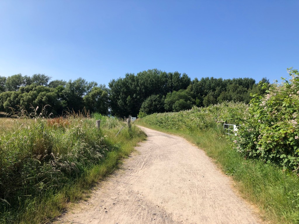Der Damm entlang des Flusses, der links hinter den Büschen verläuft.Blick auf die Hügel in der Ferne.Zugang zum Fluss direkt vom Campingplatz aus.Trotz Winter in Shorts und dünnem Pulli unterwegs – bei sonnigen 18 Grad.Trails im nahegelegenen Miniwald.