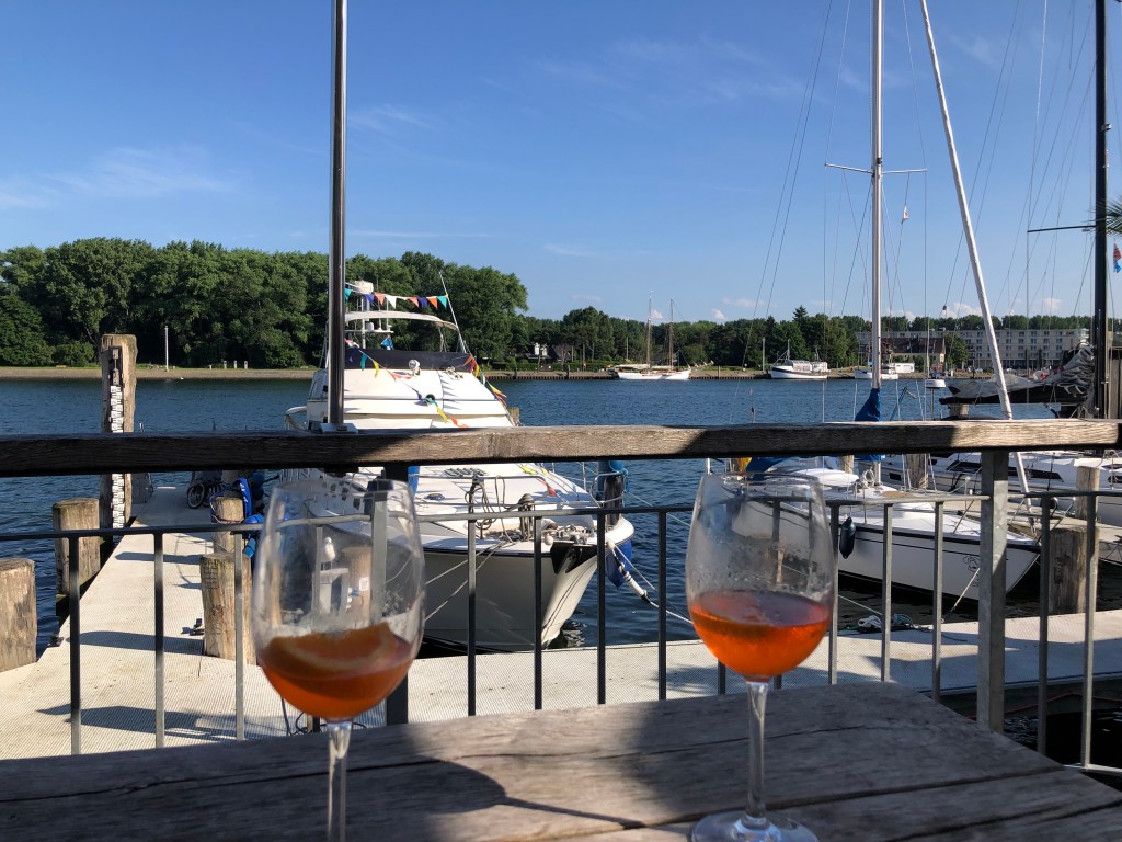 Blick von der Fähre aus auf Travemünde.Paddy auf der Fähre.Stadtbummel in Travemünde.Abendessen mit Aperol Spritz und Ausblick auf den Fluss.