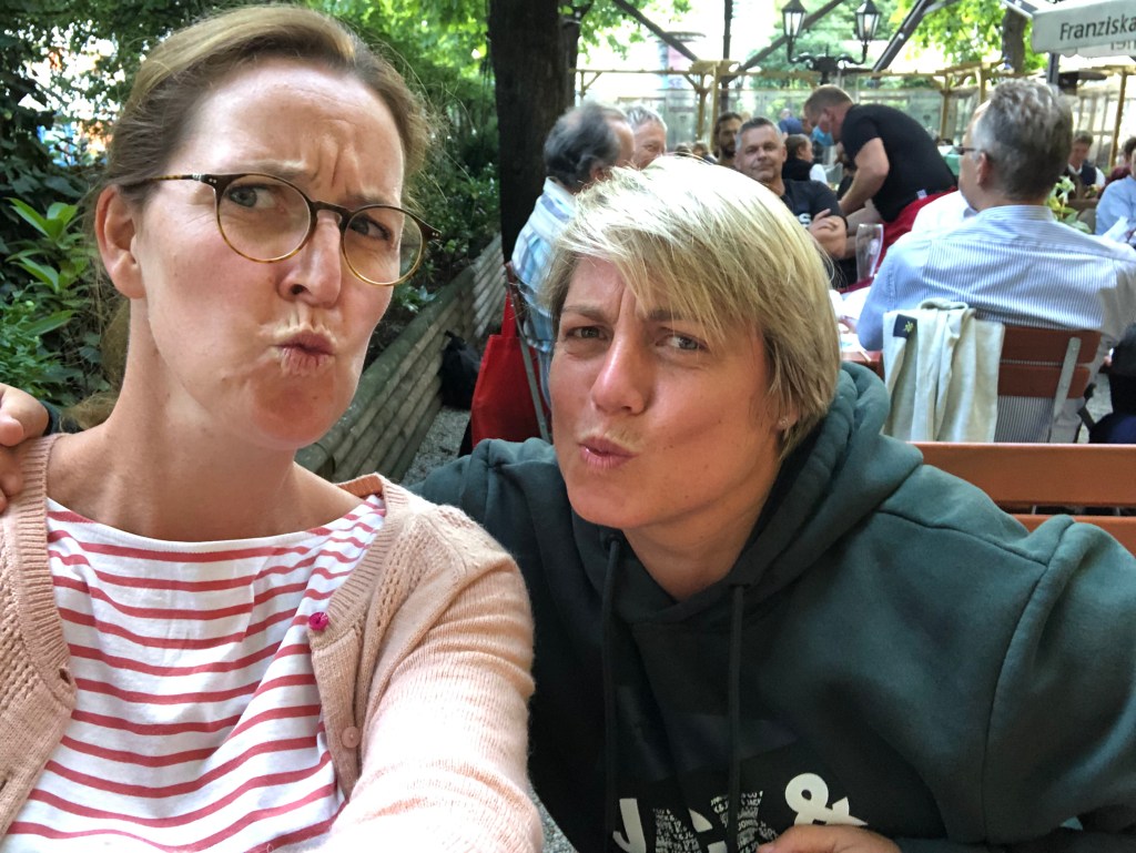 Am Nachmittag trafen wir uns mit Moni und Sandra (mit Michi und Kira), zwei meiner Ex-Kolleginnen, im Biergarten vom „Schinkenpeter“. Auch das war ein sehr cooler Nachmittag, und ich werde die beiden sehr vermissen! Später kam dann noch ganz spontan Kathrin, meine Ex-Mitbewohnerin und Ex-Referendariatskollegin vorbei, mit der wir dann den Abend noch im Biergarten genossen und quatschten, nachdem die anderen schon gegangen waren. Es war echt super, dass das noch geklappt hat, ich hatte gar nicht mehr damit gerechnet, Kathrin nochmal zu sehen, bevor wir fliegen. Leider hab ich vor lauter Quatschen ganz vergessen, Bilder von Kathrin und mir zu machen 😦