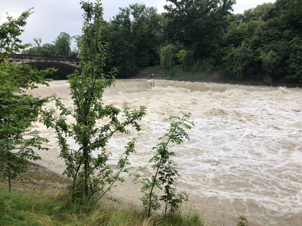 Abends schlugen wir uns die Bäuche im „Hans im Glück“ mit Pommes, Burgern und Cocktails voll, sehr lecker und sehr lustig! Sonntag morgen waren wir mit Frank und Julia zum Frühstück im „Café Haidhausen“ verabredet. Danach waren wir so voll, dass wir einen Spaziergang an der Isar brauchten, um uns wieder wohl zu fühlen. Die Isar war nach dem ganzen Regen der letzten Tage beeindruckend!
