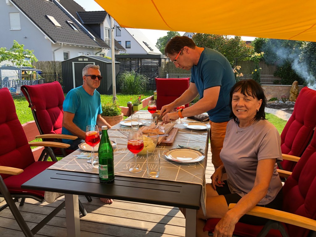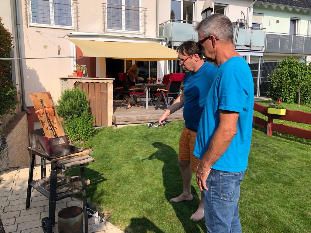 Thorsten und Paddy beim Flammlachs-Zubereiten im Garten.Den ließen wir uns dann mit Krautsalat und Campari-Soda schmecken!Auch den Biergarten in Kleinostheim am Main wollten wir nochmal genießen – hier Claudi und ich.
