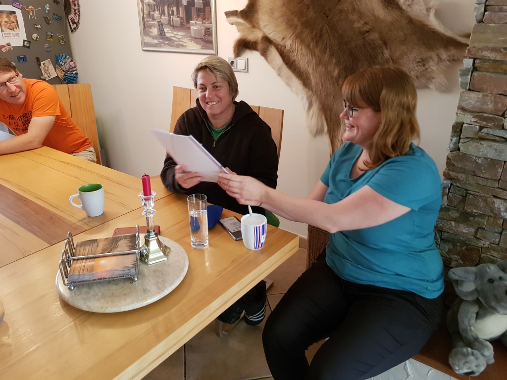 Paddy; Chris und ich beim Topwords-Spielen.