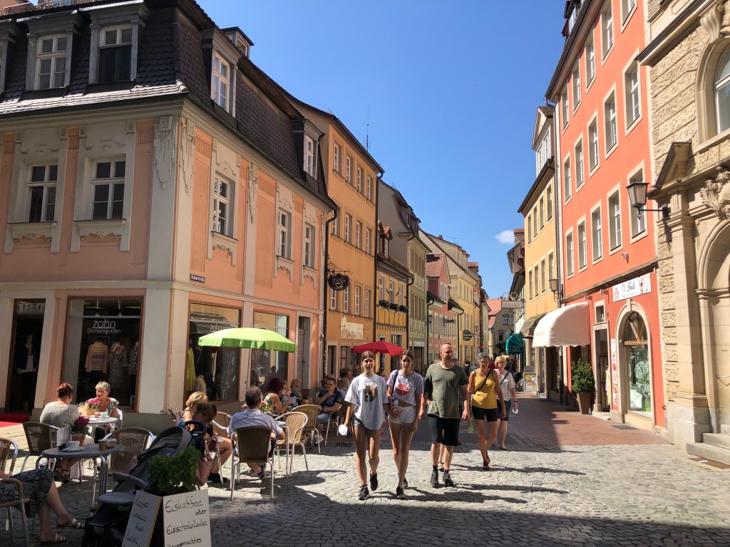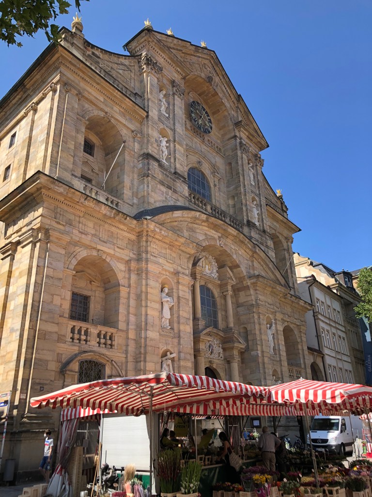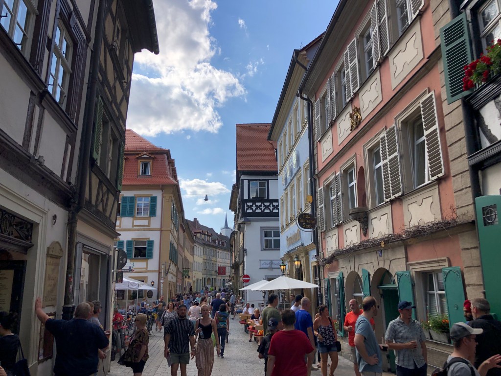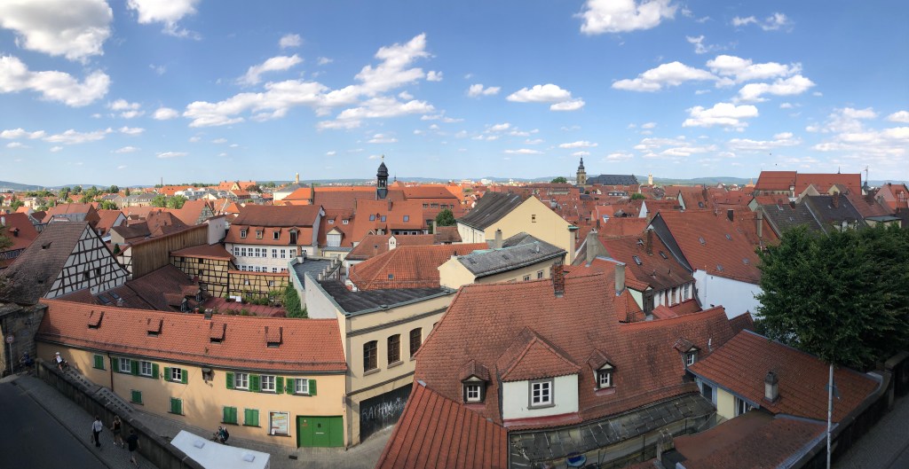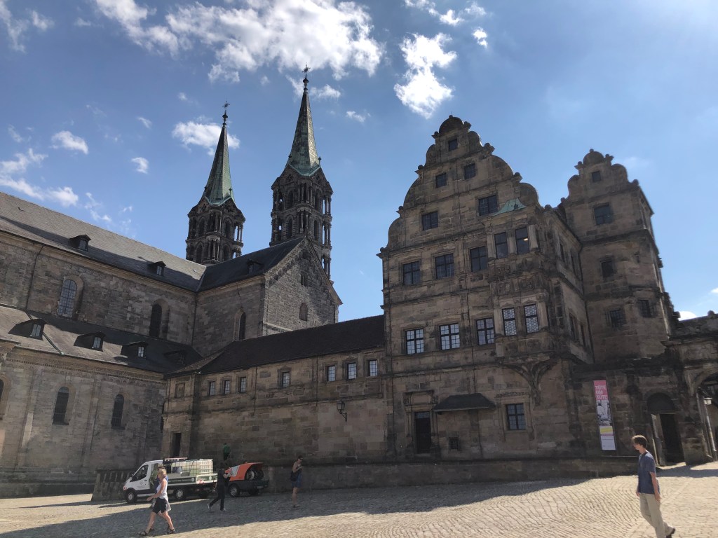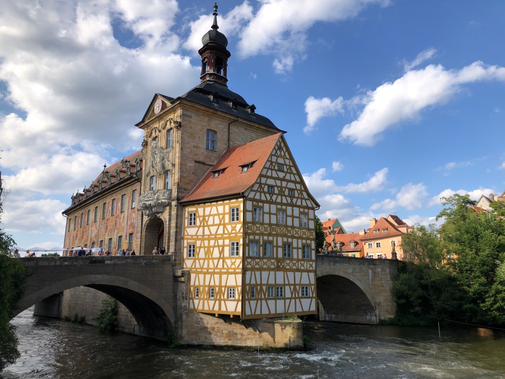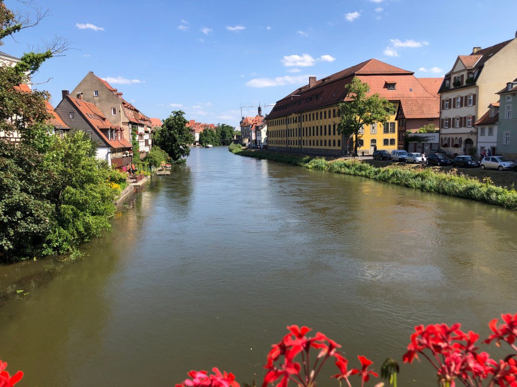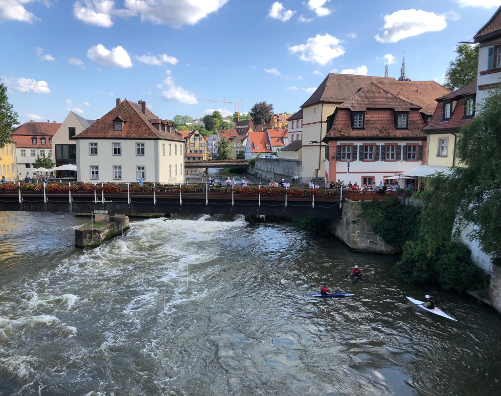 Am Freitag fuhren Paddy und ich nach Bamberg (unsere definitiv letzte Städtetour hier), um uns die Stadt ein wenig anzusehen, aber hauptsächlich, um Kati vor unserer Abreise nochmal zu sehen. Natürlich hatte ich von Kati und Laura unzählige Male gehört, wie schön Bamberg doch sei, aber es dann selbst zu sehen, war echt der Hammer! Paddy und ich waren beide hin und weg und hätten uns gewünscht, ein paar Tage hierfür eingeplant zu haben, aber leider mussten wir uns mit einem Tag begnügen. Und so flanierten wir zuerst zu zweit durch die Stadt und dann zusammen mit Kati, die uns als Ortskundige die ganzen wichtigen Orte (wie z.B. das Wirtshaus zum Schlenkerla) zeigte, und das bei bestem Wetter! Hier ein paar Eindrücke: