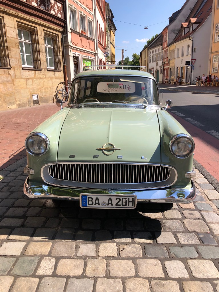 Die Innenstadt.St. Martins-Kirche.Während ich mir schöne bzw. interessante Bauwerke anschaute…… interessierte sich Paddy wie immer mehr für alles, was alt ist und Räder und einen Motor hat 🙂Flussromantik von einer der vielen Brücken.Der Bamberger Dom.Der Rosengarten…… mit wunderschönem Ausblick über ganz Bamberg…… und drei gut gelaunten Leuten, die den Ausblick verstellen 😉Kati und Paddy mit dem typischen Bamberger Rauchbier (und meinem Radler).Bei dem guten Wetter war allerhand los in der Stadt!Ausblick auf Kajakfahrer und ein paar mehr Brücken.Das alte Rathaus – breathtakingly beautiful!!!Eine fette Frau vor der fetten Frau 😉Kati und ich in wohl einem unserer (für jetzt) letzten gemeinsamen Bilder – ich werde dich sehr vermissen!