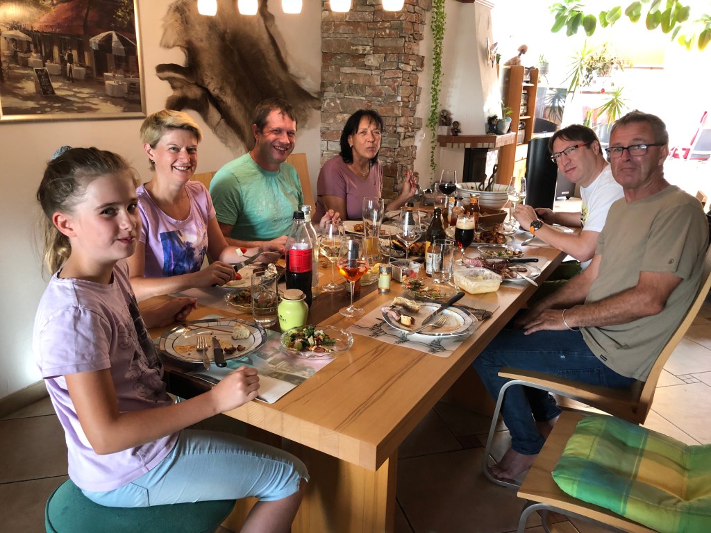 Paddy, Thorstens Eltern, Claudi und Thorsten beim Vesper.
