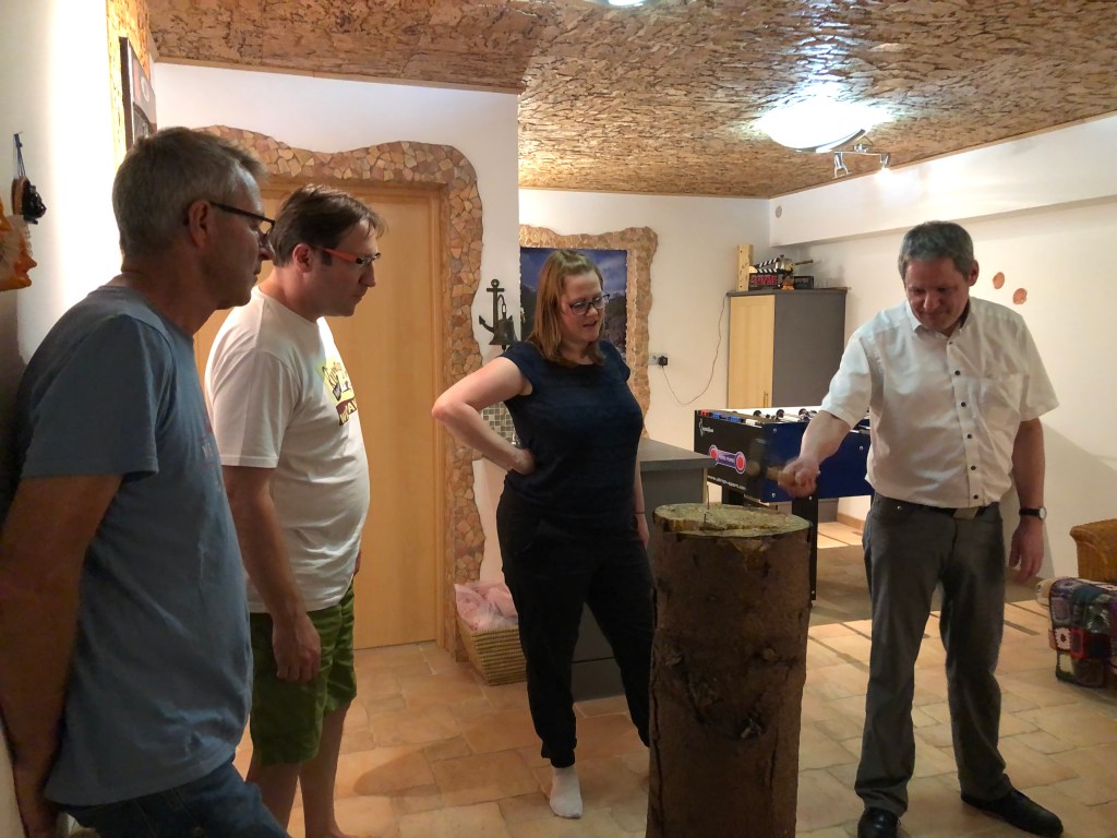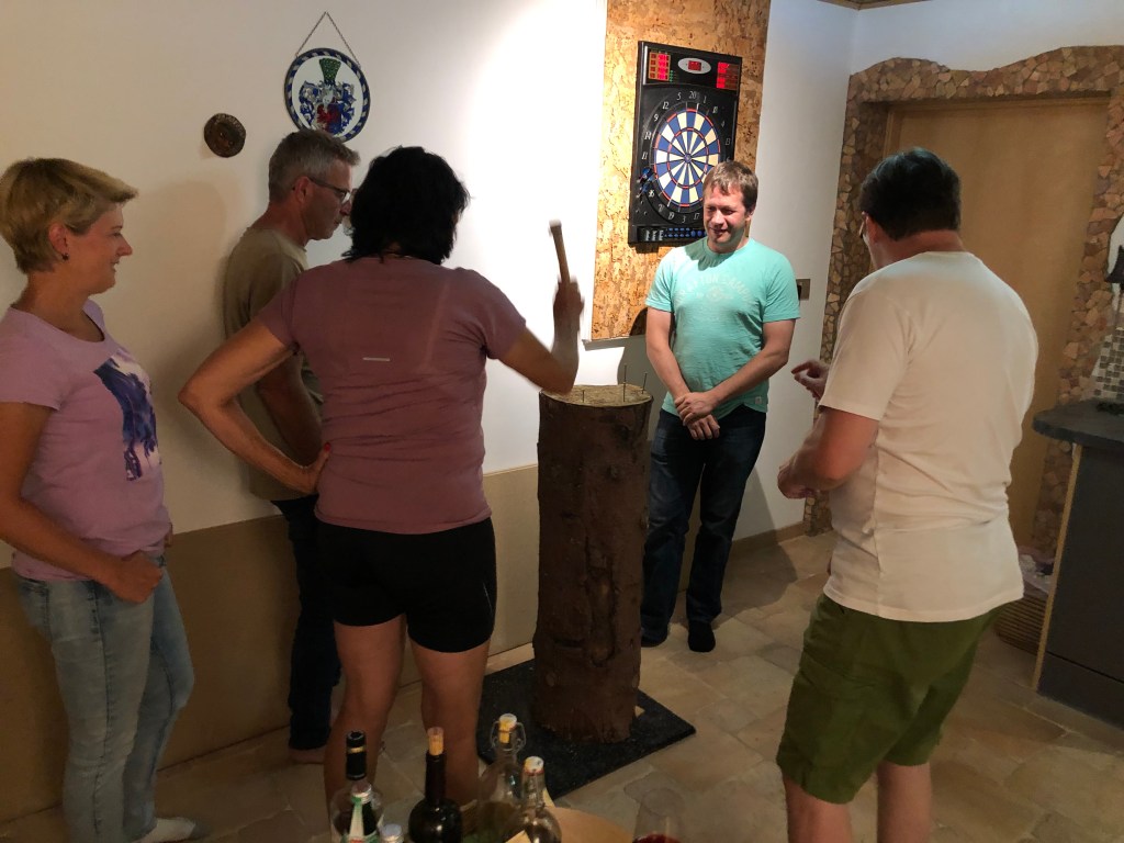 Sina, Sandra, Uli, Claudi, Thorsten und Paddy beim Essen – es gab Lamm, Spieße, Würste und Steaks, superlecker!Natürlich mussten die Kalorien wieder abtrainiert werden! Während Paddy und Thorsten dies beim Kickern taten, lieferten sich Claudi, Sandra, Sina und Uli ein Dart-Match.Um auch die Auge-Hand-Koordination zu trainieren, folgte eine Runde Nageln...… begleitet von jeder Menge „Erfrischungsgetränken“, was man an Ulis glücklichem Gesicht erkennen kann.