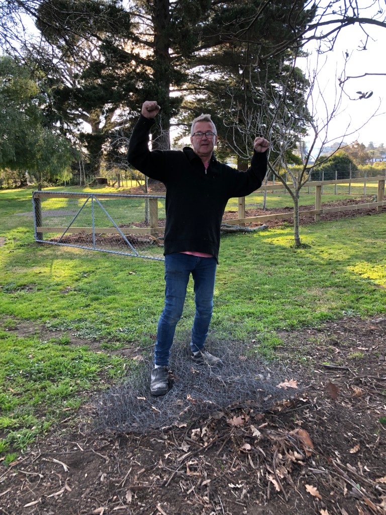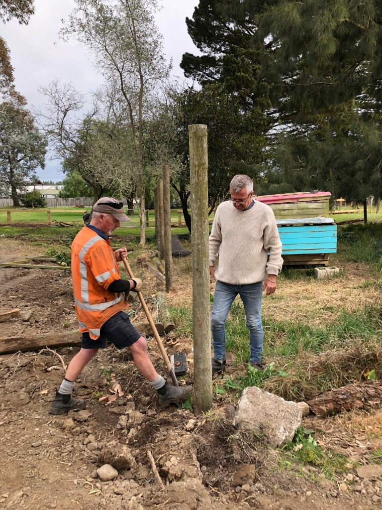 Besser als im Putzen bin ich jedoch bei allem, was an physischer Arbeit draußen anfällt. Da ein Hund Paddy’s Hühner in seiner Abwesenheit getötet hat, beschlossen wir, die traurige Gelegenheit dazu zu nutzen, das Hühnergehege abzubauen (wir werden es später in einer anderen Ecke des Geländes wieder aufbauen). Dafür musste der Zaun mitsamt den tief im Boden steckenden Holzpfosten entfernt werden – das hat Spaß gemacht! 🙂