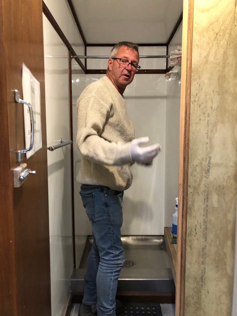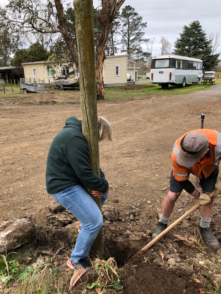 Krass, jetzt ist unsere erste Woche hier in Waipawa schon fast rum! Wir sind immer noch dabei, uns (wieder in Paddy’s Fall) einzugewöhnen, aber es wird von Tag zu Tag besser. Wir müssen beide unsere Rolle erst finden – Paddy ist gewöhnt, fast alles alleine zu machen, und ich hab noch keine Ahnung, was auf einem Campingplatz alles zu tun ist. Momentan ist es super-ruhig, da während des Lockdowns niemand kommen (oder gehen) kann, so dass nur die „residents“ hier sind (ca. 20 Leute) – es fühlt sich ein bisschen wie ein kleines Dorf an. Das gibt mir ein bisschen Zeit, zu lernen, was alles getan werden muss und wie die Dinge hier laufen. Von Sandy hab ich schon das von ihr neu eingeführte Campingplatz-Programm am Computer gezeigt kriegt, und Paddy gab mir eine Einführung ins Kloputzen (und alle anderen Gemeinschaftsräume), so dass wir uns diese Arbeit die letzten drei Tage teilen konnten – er die Männerklos und -duschen, ich die Damen. Küche und Waschküche machen wir zusammen. Aber da zur Zeit nicht viele Leute da sind, und die Leute, die hier wohnen, zum Glück sehr sauber sind, ist es kein aufwändiger Job.