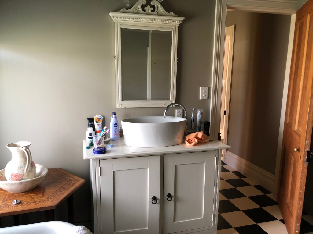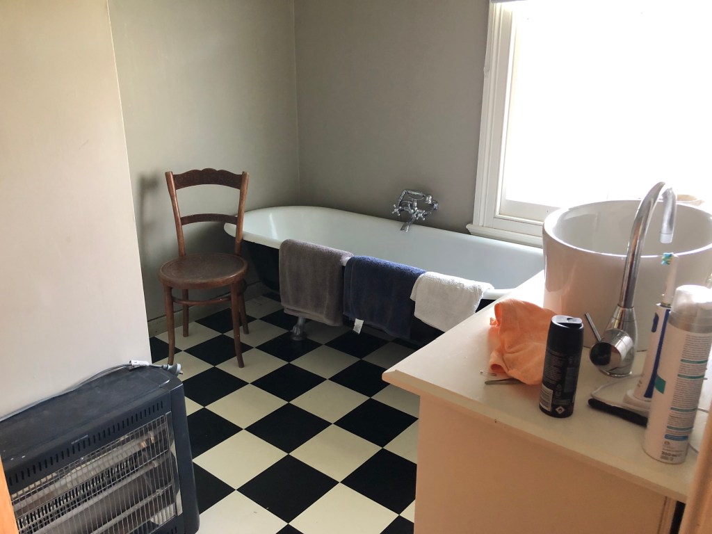 Mein Blick morgens von der Frühstückstheke in der Küche nach draußen zur Terrasse und zum Garten. Die Küche…… die eine echt hohe Decke hat – voll schön!Der Flur von der Küche durch das ganze Haus. Links geht es zur Haustüre und dem Bad, rechts zum Esszimmer und geradeaus zu den anderen Zimmern.Das (unaufgeräumte) Esszimmer mit tausend Sachen drin, die da nicht hin gehören. Diesen Raum nutzen wir gerade gar nicht.Die Toilette in einem Extraraum neben dem Bad.Das Bad mit dem von Paddy selbst (um-)gebauten Unterschrank.Die Badewanne und der besagte Heizstrahler, dahinter ist die Dusche.Das große Wohnzimmer, das leider sehr dunkel und ein Durchgangszimmer ist.Das kleine Wohnzimmer, das ich viel schöner finde, weil es viel heller ist und einen tollen Blick in den Garten hat.Blick von der anderen Seite des Zimmers auf den Kamin. Darüber ein Bild, das von einem meiner Fotos von Paddy’s Schwester abgemalt wurde – sie ist echt gut!Unser Schlafzimmer…… mit einer coolen, zum Sofa umgebauten breiten Fensterbank.Paddy und ich an unserem Lieblingsplatz auf der Veranda vor unserem Schlafzimmer.Das im Moment ungenutzte Gästeschlafzimmer, eigentlich das Hauptschlafzimmer, aber uns hat der kleinere, hellere Raum besser gefallen.Paddy’s „shed“ – Garage und Werkstatt in einem.