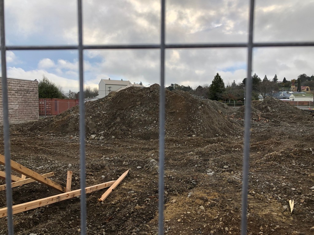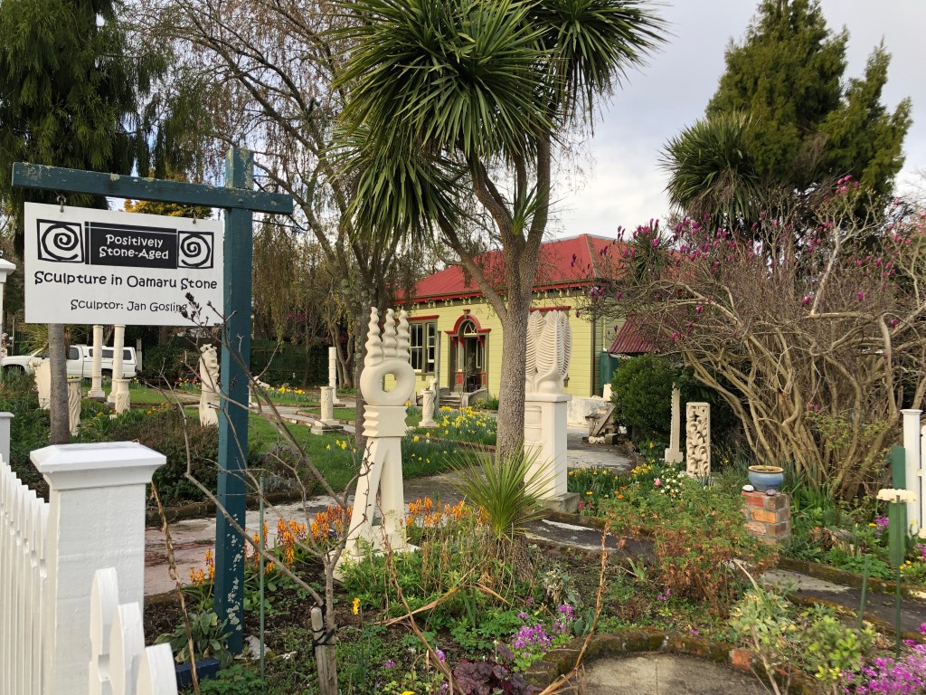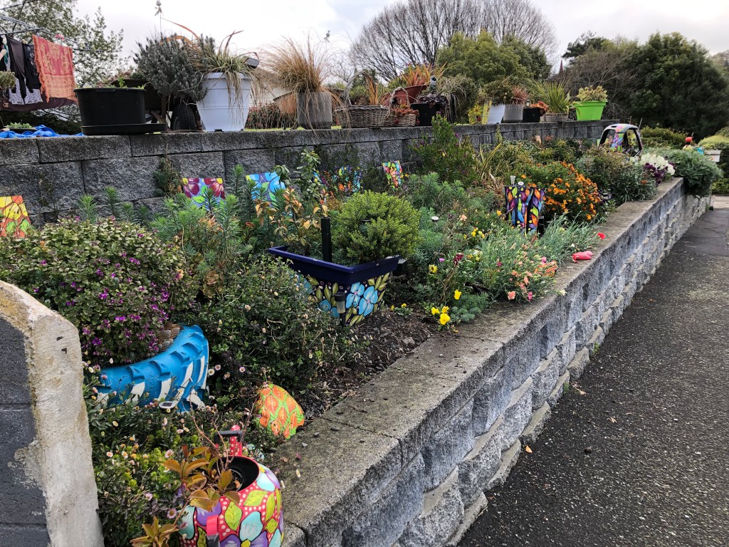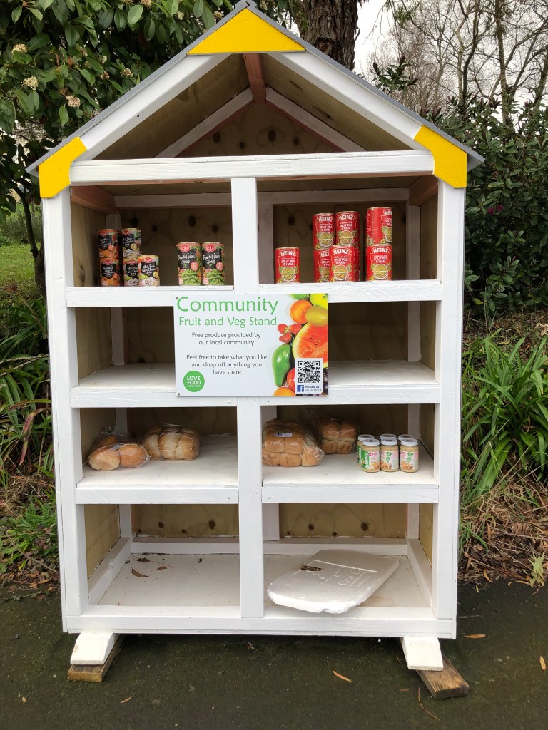 Der Waipawa River flussaufwärts Richtung Berge fotografiert…… und flussabwärts Richtung Meer. Interessanter Garten einer Bildhauerin…… und ein bunter Garten einer Malkünstlerin 😉Die katholische Kirche in Waipawa.Der örtliche Supermarkt – bzw das, was nach dem Brand von ihm übrig ist.Food-Tauschbörse – voll die gute Idee!!