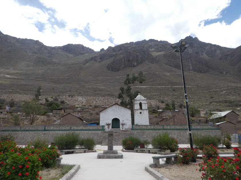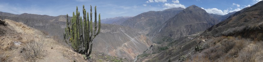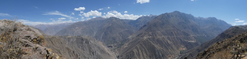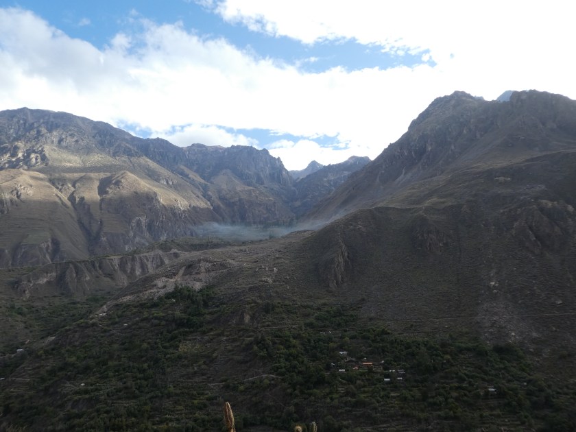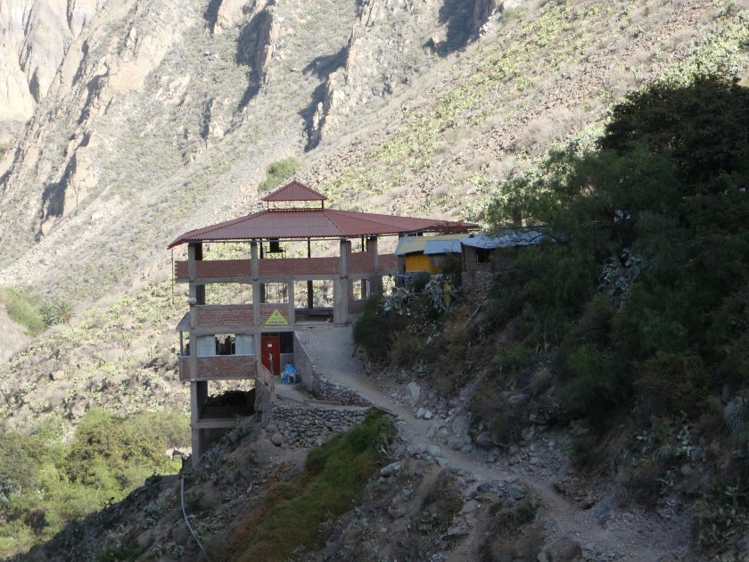 Nach mehr als 7-stündiger Busfahrt (der Bus war unendlich langsam!) durch teilweise atemberaubende Landschaft kamen Anne und ich Dienstag nachmittag um 16.30 Uhr endlich in Cabanaconde an. Wir checkten im Pachamama Homestay ein und gönnten uns nach vielen Nächten in Schlafsälen mal ein Zimmer nur für uns – was für ein Luxus! Der Besitzer des Hostals ist gleichzeitig Guide und gibt jeden Tag Tipps für Touren durch den Colca-Canyon, die wir uns natürlich nicht entgehen lassen wollten. Und so fanden wir uns um 17.30 Uhr im Restaurant des Pachamama ein, zusammen mit anderen Wanderwütigen, wo wir eine „Sammeleinweisung“ bekamen und anschließend individuelle Touren absprechen konnten. So gut beraten, stand unsere Tour am Abend noch fest: Wir würden am ersten Tag nach Llahua den Canyon hinabwandern, am zweiten Tag durch den Canyon nach San Juan de Chuccho und am dritten Tag aus dem Canyon hinaus zurück nach Cabanaconde. Nach einem leckeren Abendessen ging es dann früh ins Bett – wir wollten morgen vor der Wanderung noch mit dem Bus zum Cruz del Condor, um Kondore zu beobachten.