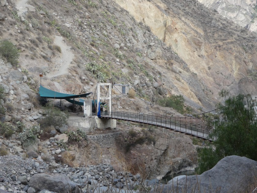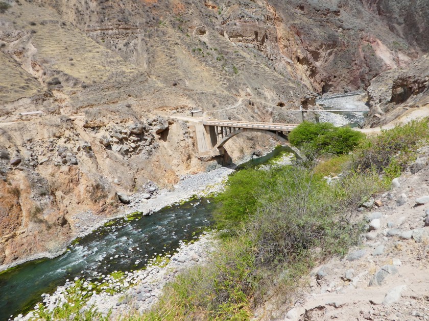 Ca. 1200m tiefer kamen wir dann am Grund des Canyons an, dem Rio Colca. Hier gab es nicht nur eine Brücke für die Autos, sondern auch eine sehr wackelige Hängebrücke für Fußgänger, die aber wegen Altersschwäche gesperrt war. Außerdem hatte der Fluss einen Geysir zu bieten: