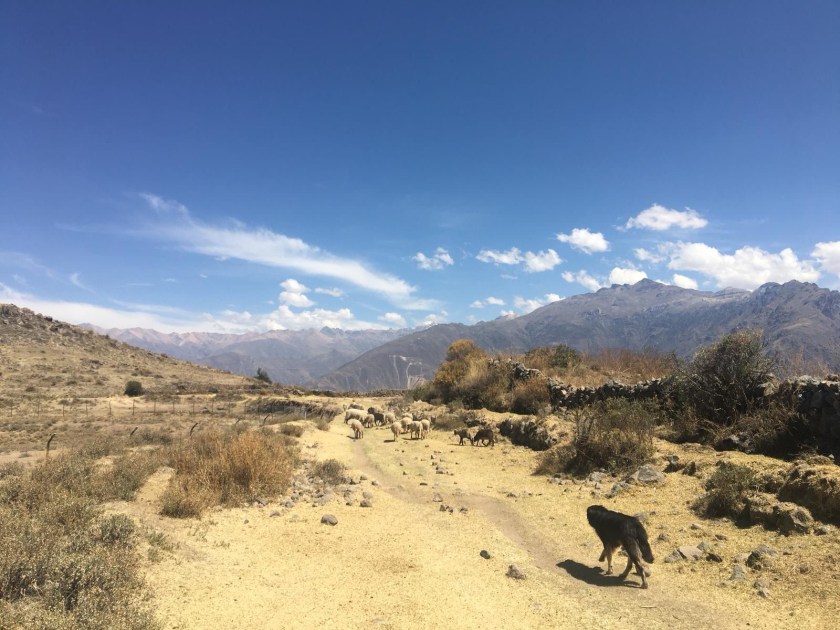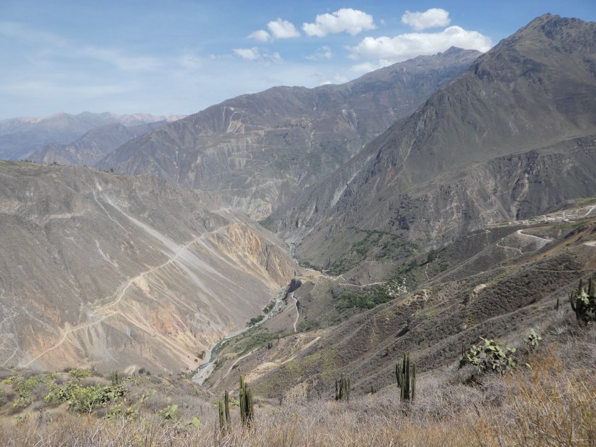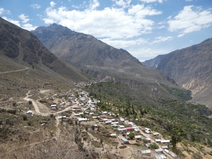 Nach erfolgreicher „Kondorbesichtigung“ schnappten wir uns einen Minibus zurück nach Cabanaconde und starteten unsere Wanderung nach Llahua. Zuerst ging es mit wundervollen Ausblicken oben am Rand des Colca-Canyons entlang zum ersten Mirador. Um diese Jahreszeit ist es sehr trocken hier, weshalb alles so braun und etwas trostlos aussieht.