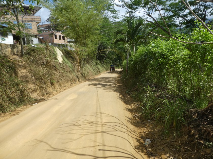 Am Sonntag wollte ich mal wieder ein bisschen Wandern gehen – in der näheren Umgebung von Tarapoto, und deswegen kommt man überhaupt hierher, gibt es zahlreiche Wasserfälle und jede Menge Natur, alles ist grün oder blüht in auffälligen Farben. Ca 5 km nördlich von Tarapoto, also fußläufig zu erreichen, liegt das Naturschutzgebiet Alto Shilcayo, direkt an/in der Cordillera Escalera. Das war mein Ziel bzw. ein Wasserfall dort, der Catarata de la Novia, der mit ein bisschen Phantasie wie ein Brautkleid aussieht, deshalb der Name. Zunächst musste ich jedoch durch die Stadt laufen und ein paar Kilometer aus der Stadt raus. Sobald ich aus der Stadt raus war, wurde es grün: