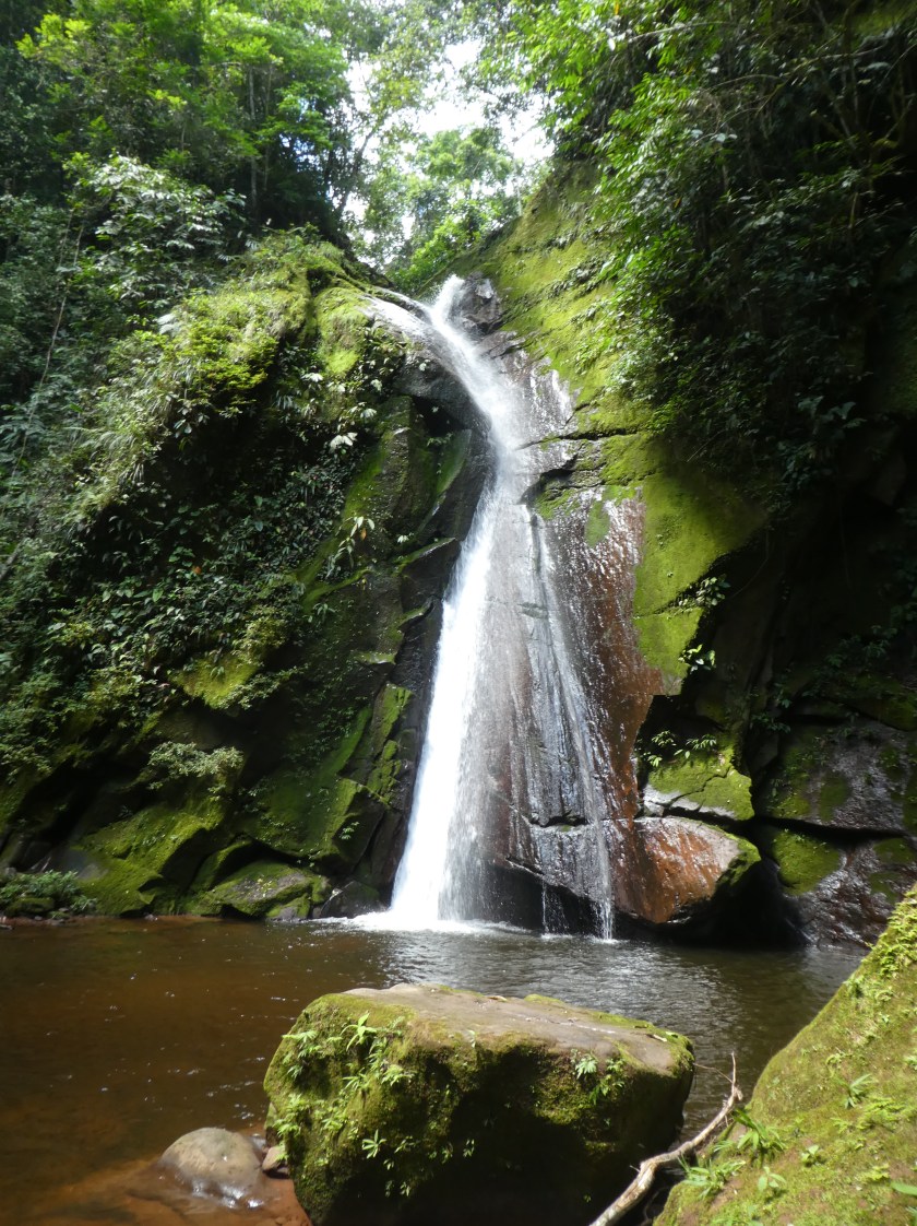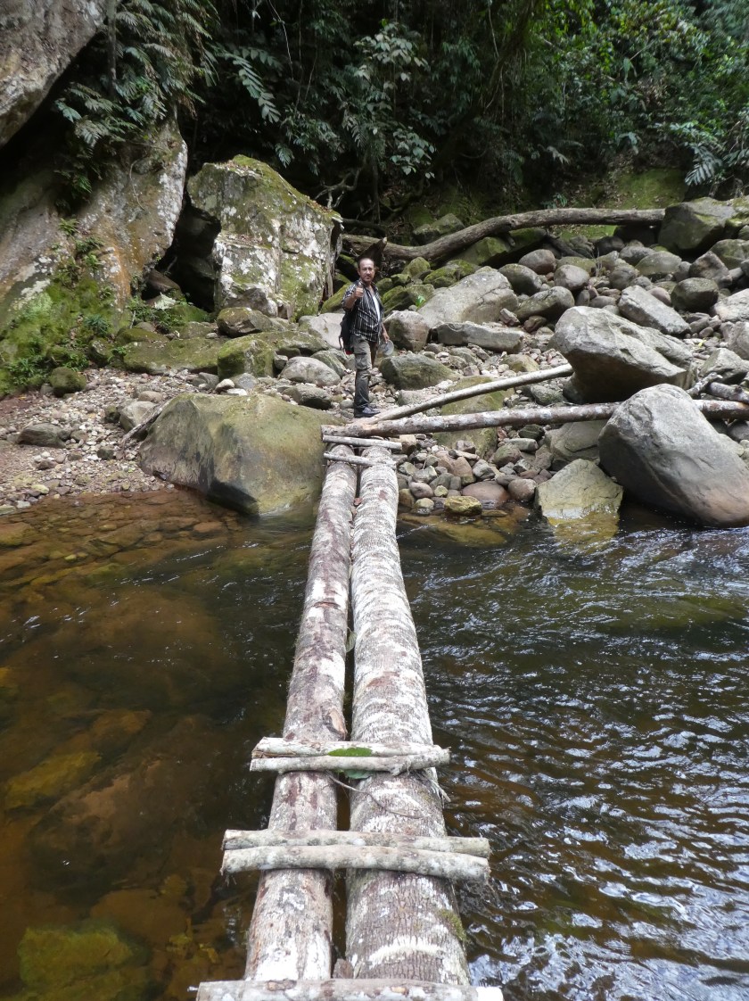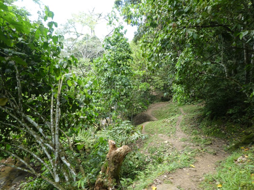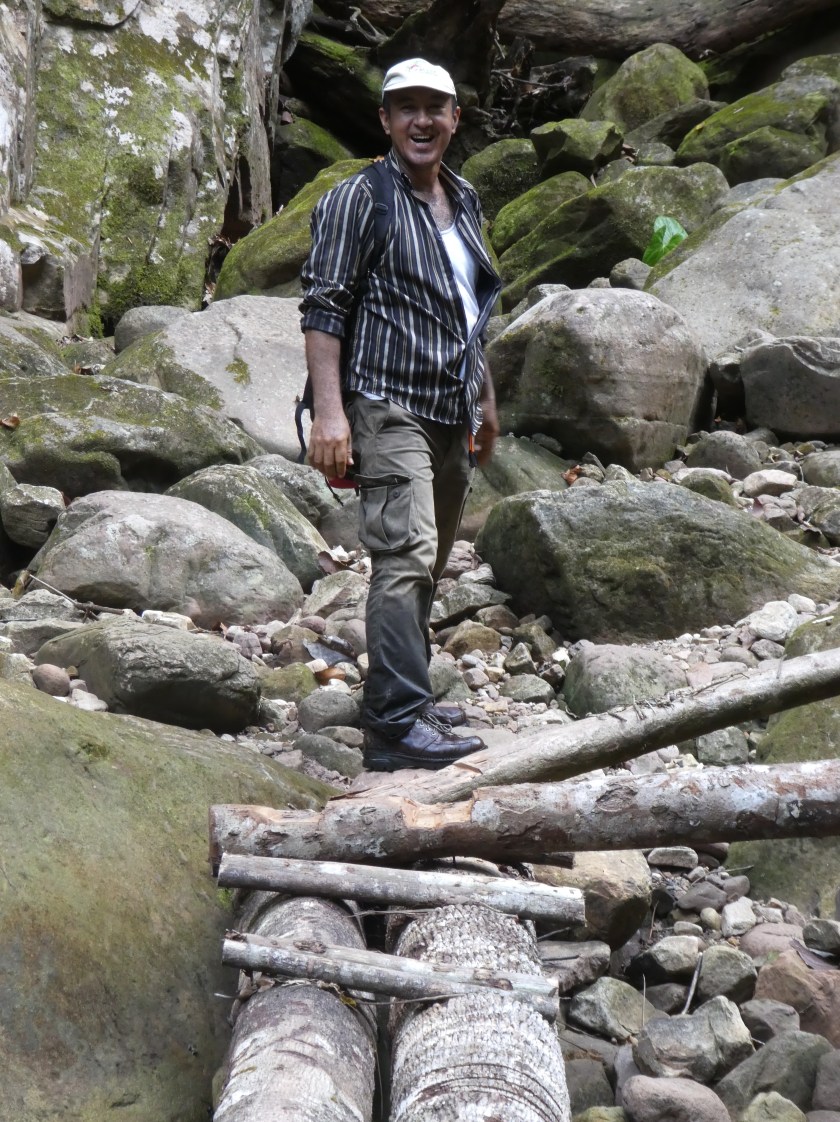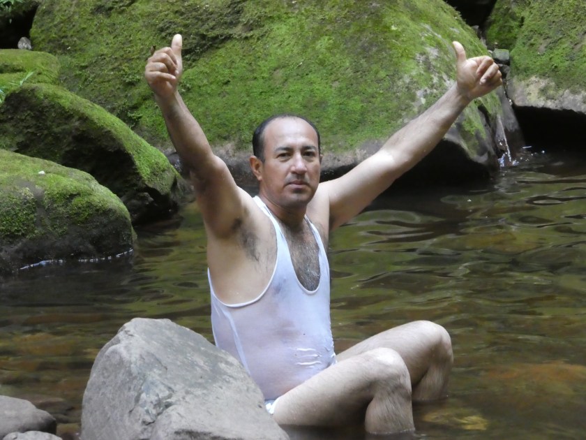 Da der Typ mit keinem Wort einen Guía (=Guide) erwähnte, dachte ich, es sei leicht zu finden – weit gefehlt! Das Gebiet ist riesig, und man muss ständig durch den Fluss laufen, d.h. man sieht nicht, wo der Weg ist. Schilder gibt es natürlich keine. Logischerweise verlief ich mich dann auch. Nach einer Weile kamen mir drei Männer entgegen, die mich fragten, wo ich hinwolle. Als ich ihnen den Wasserfall nannte, schüttelten sie den Kopf – falsche Richtung! Einer von ihnen, Nehemias, kurz Nemi, hatte dann entweder Mitleid oder gerade nichts Besseres zu tun und beschloss, mich dorthin zu begleiten. Ich war so froh! Den Weg hätte ich nie gefunden!!! Es ging hin und her zwischen den beiden Flussufern, bestimmt 15x durch den Fluss und wieder hinauf auf einen Berg. Super-abenteuerlich und bei der Hitze auch ziemlich anstrengend!