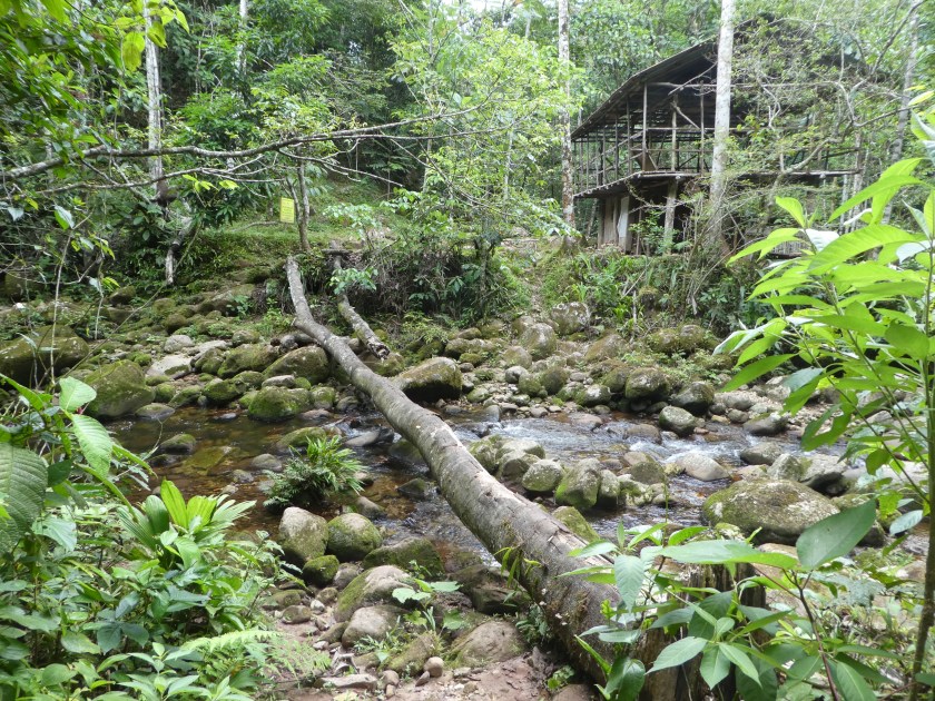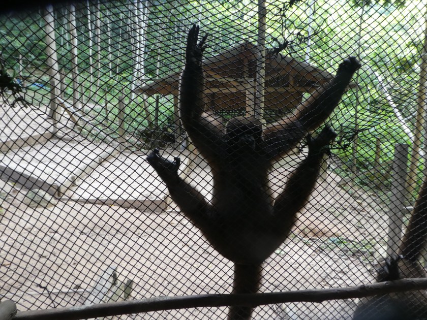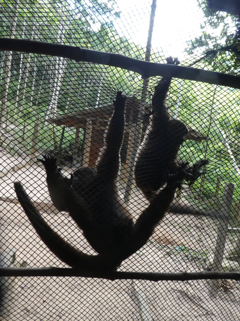 Ich teilte meine Müsliriegel brüderlich mit Nemi und wir verbrachten bestimmt zwei Stunden dort. Da Nemi kein Englisch konnte, verlief die Unterhaltung ziemlich stockend (my Spanish sucks!), aber so musste ich wenigstens mal üben – und er war sehr geduldig und formulierte immer wieder um, wenn ich ihn nicht verstand. Nach ausgiebigem Bad und Trocknen in der Sonne brachen wir für den Rückweg auf. Nemi kannte einen anderen Weg, der uns zunächst zu einem Refugio für Affen brachte. Die Affen sind hier frei im Wald unterwegs, während die Pfleger (?) in einem eingezäunten Raum sind. Auf dem Weg zu dieser eingezäunten Küche hüpften gleich mal drei Affen auf mich drauf und belagerten mich, bis ich mich in die Küche retten konnte. Dann hingen sie außen am Gitter und beobachteten, was in der Küche so vor sich ging.