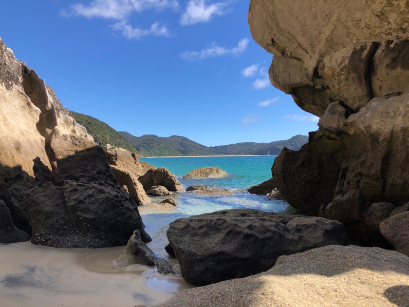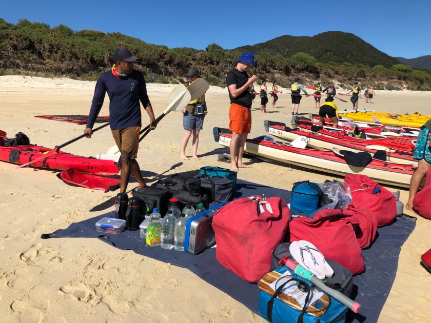 Nach dem Packen und der Einweisung ging’s dann endlich los zum und auf das Wasser. Und es wurde wie erwartet ein sehr cooler Trip! Nicht nur war die Stimmung super, auch das sportliche Niveau beim Kayaking war wesentlich höher als bei meiner letzten Kayaktour, da alle vorher schonmal Kayak gefahren waren bzw. sowieso regelmäßig fuhren. Da konnte ich mich richtig austoben! Die Landschaft war ganz anders als im Abel Tasman NP, statt Sandstränden gab es (nur bei Ebbe) Kiesstrände, alles war viel wilder, die Berge steiler. Hier ein paar Eindrücke von der Tour: