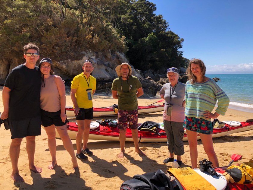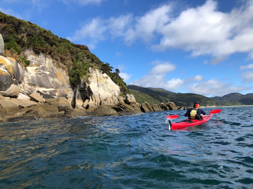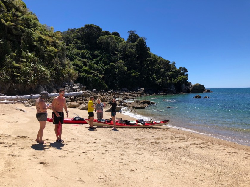 Nach dem Packen und der Einweisung ging’s dann endlich los zum und auf das Wasser. Und es wurde wie erwartet ein sehr cooler Trip! Nicht nur war die Stimmung super, auch das sportliche Niveau beim Kayaking war wesentlich höher als bei meiner letzten Kayaktour, da alle vorher schonmal Kayak gefahren waren bzw. sowieso regelmäßig fuhren. Da konnte ich mich richtig austoben! Die Landschaft war ganz anders als im Abel Tasman NP, statt Sandstränden gab es (nur bei Ebbe) Kiesstrände, alles war viel wilder, die Berge steiler. Hier ein paar Eindrücke von der Tour: