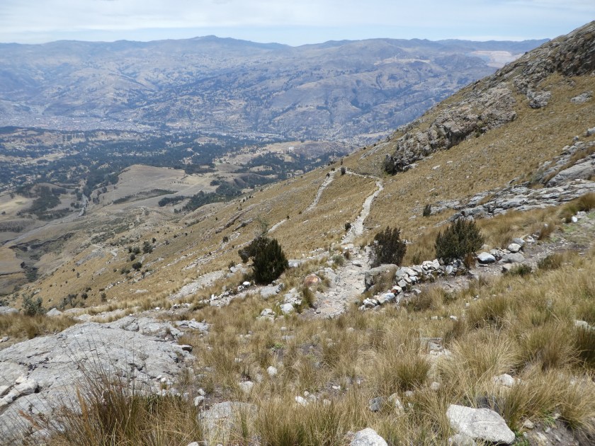 Am Freitag wollte ich erstmal eine Akklimatisierungstour-Tour machen – ich war mir nicht so sicher, ob mein Aufenthalt in Arequipa (2700m) und Lima (Meereshöhe) etwas ausgemacht hatten. Dafür suchte ich mir gleich mal eine ziemlich heftige Tour aus, die aber kaum jemand, und schon gar keine Gruppen, macht: Von den Ruinen Willkahuaín zur Laguna Ahuac. Das sind 1200hm auf nur 6 km, die Laguna liegt auf 4550m. Mit dem Bus ging’s zum Startpunkt, und um kurz nach 7 Uhr brach ich auf.